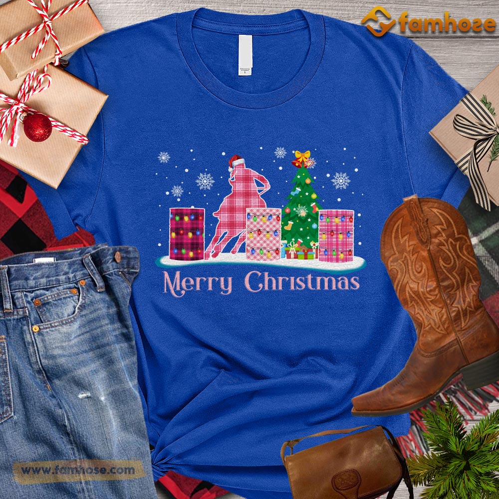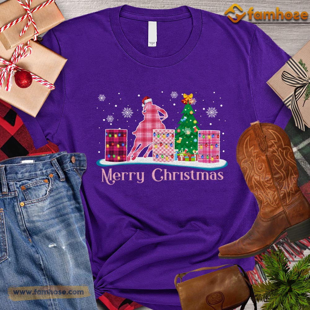 Christmas Barrel Racing T-shirt, Merry Christmas Pink Barrel With Christmas Tree Gift For Barrel Racing Lovers, Horse Riders, Equestrians