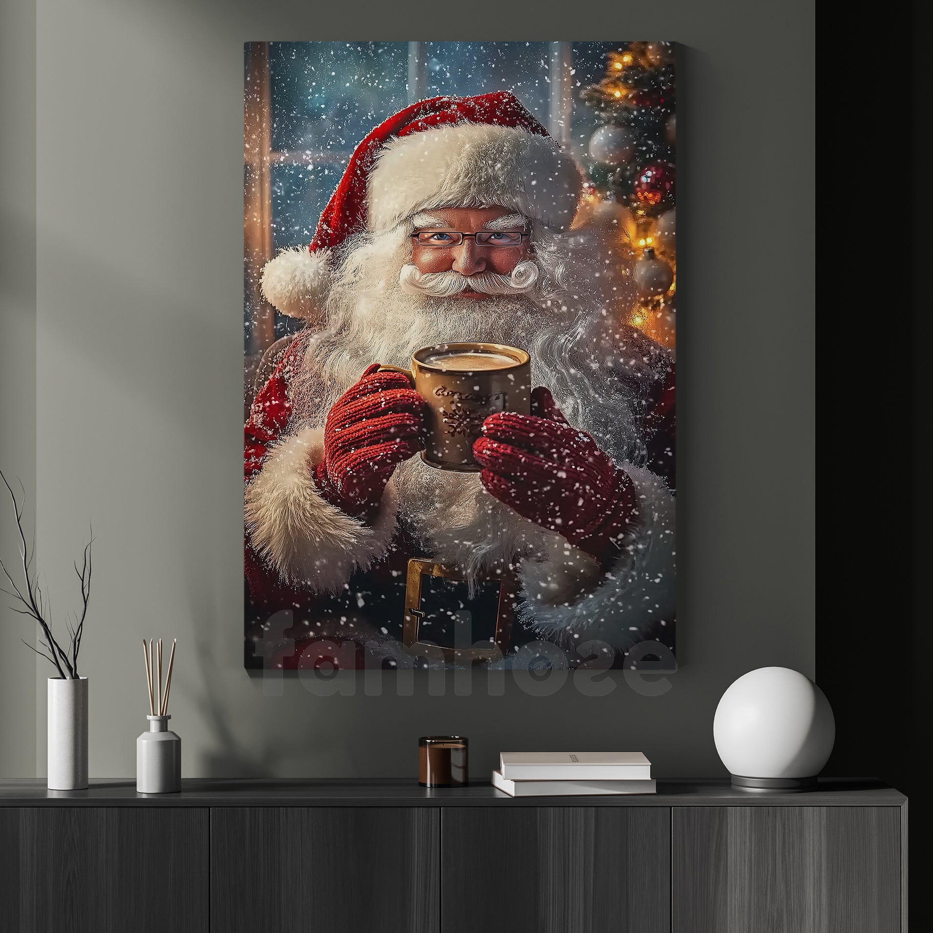 Christmas Canvas Painting, Santa Smiling With Hot Coffee Wall Art Decor, Xmas Poster Gift