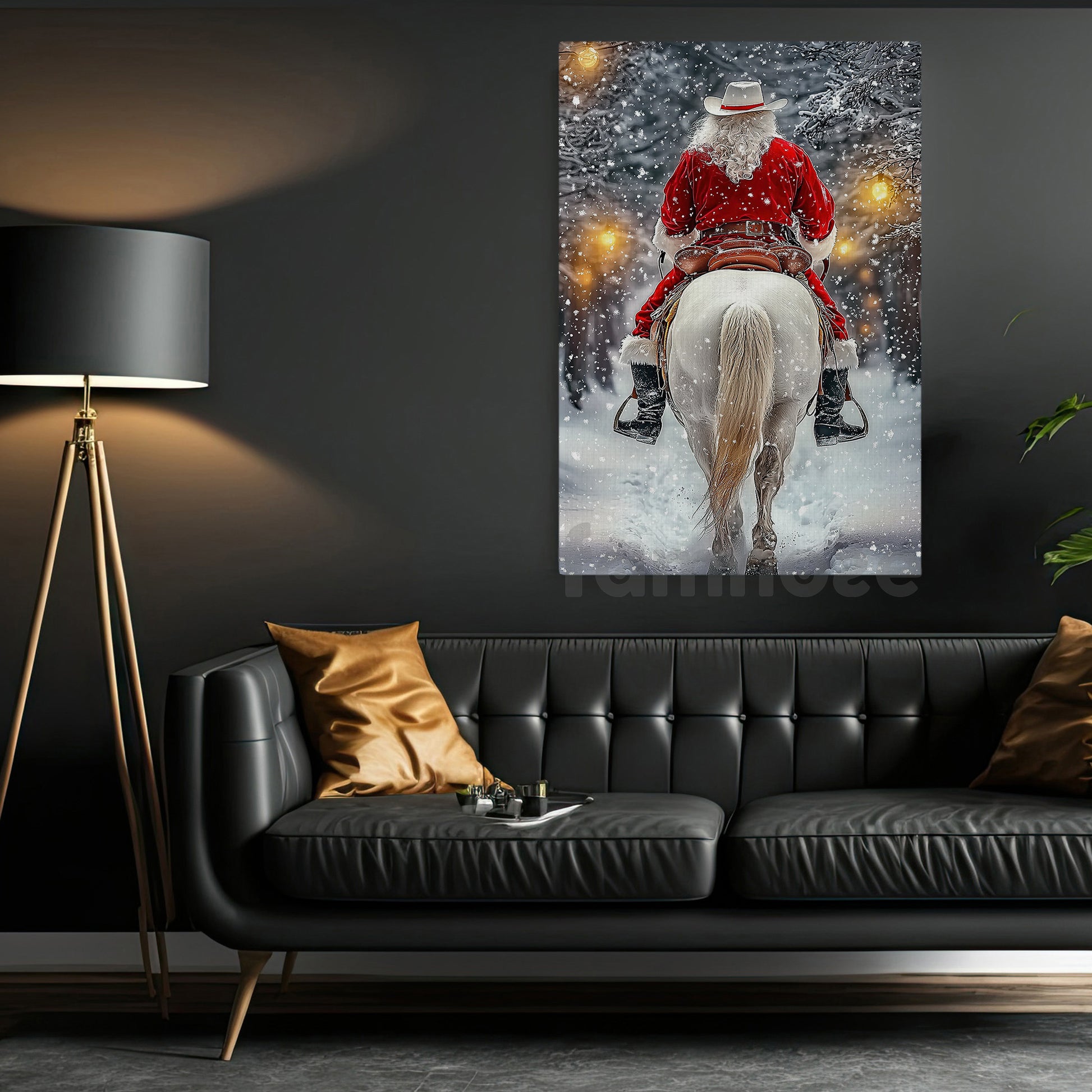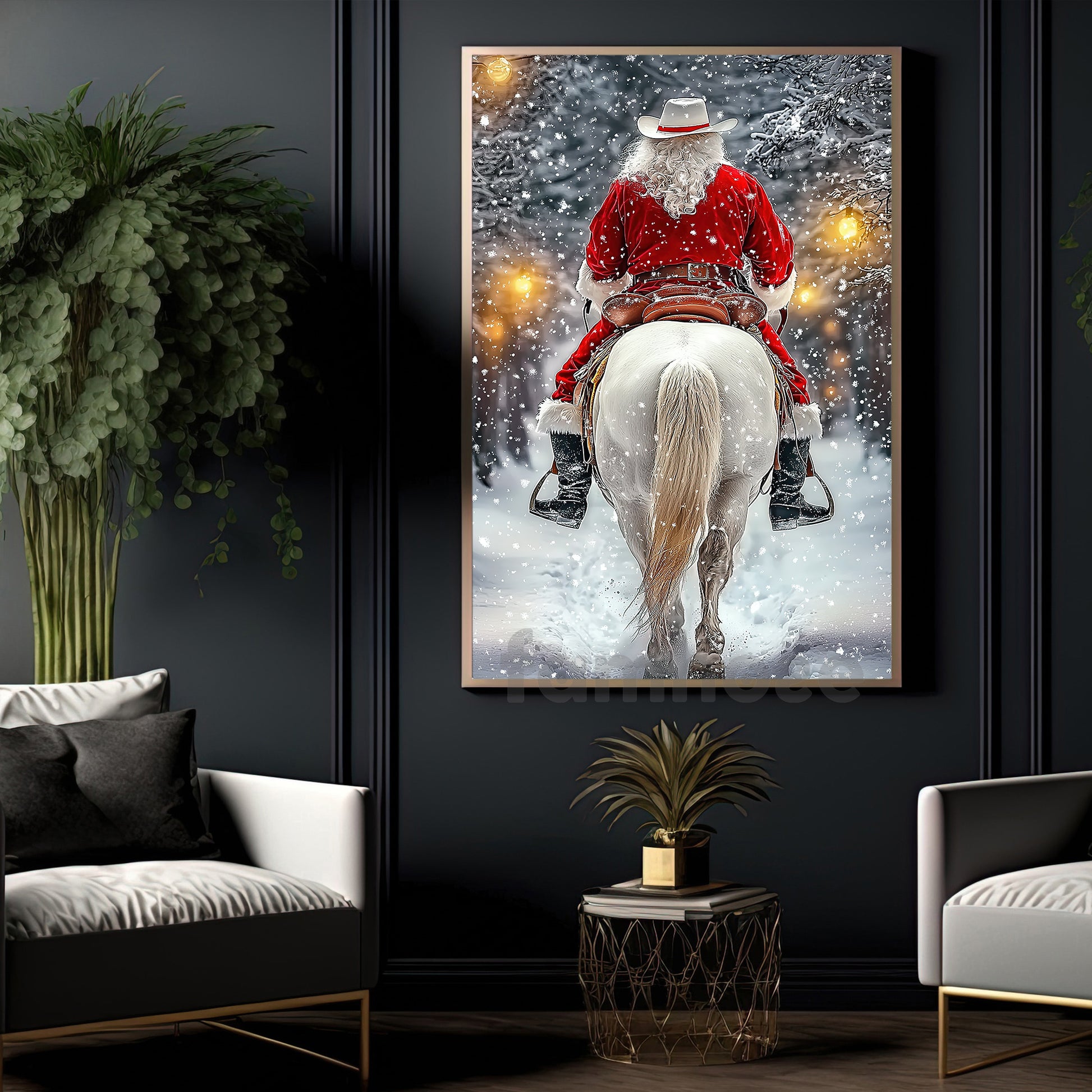 Christmas Cowboy Canvas Painting, Santa Claus Riding Horse In Snow Wall Art Decor Xmas Poster Gift For Cowboys