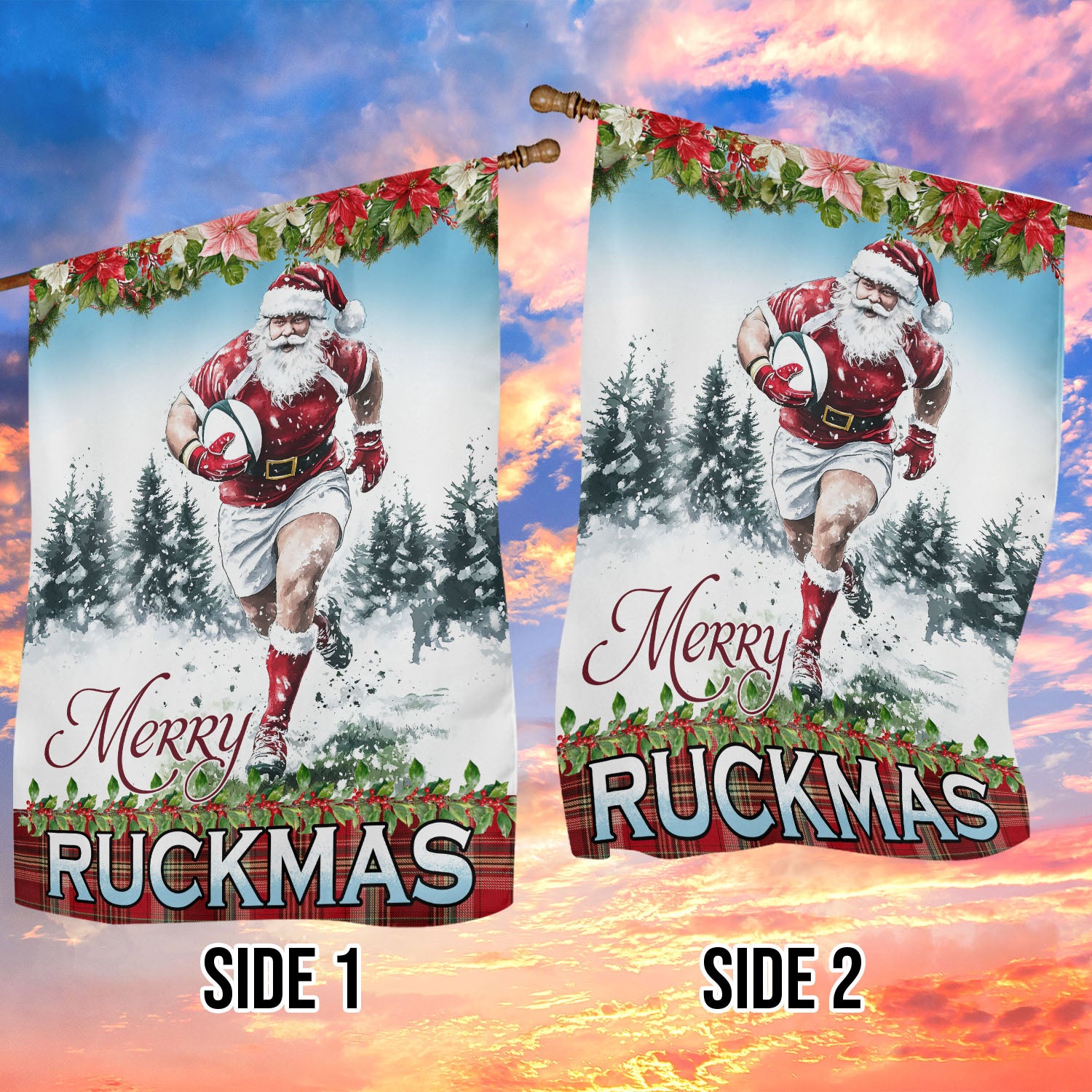 Christmas Rugby Garden & House Flag, Santa Claus Merry Ruckmas Yard Flag, Xmas Gift For Rugby Lovers