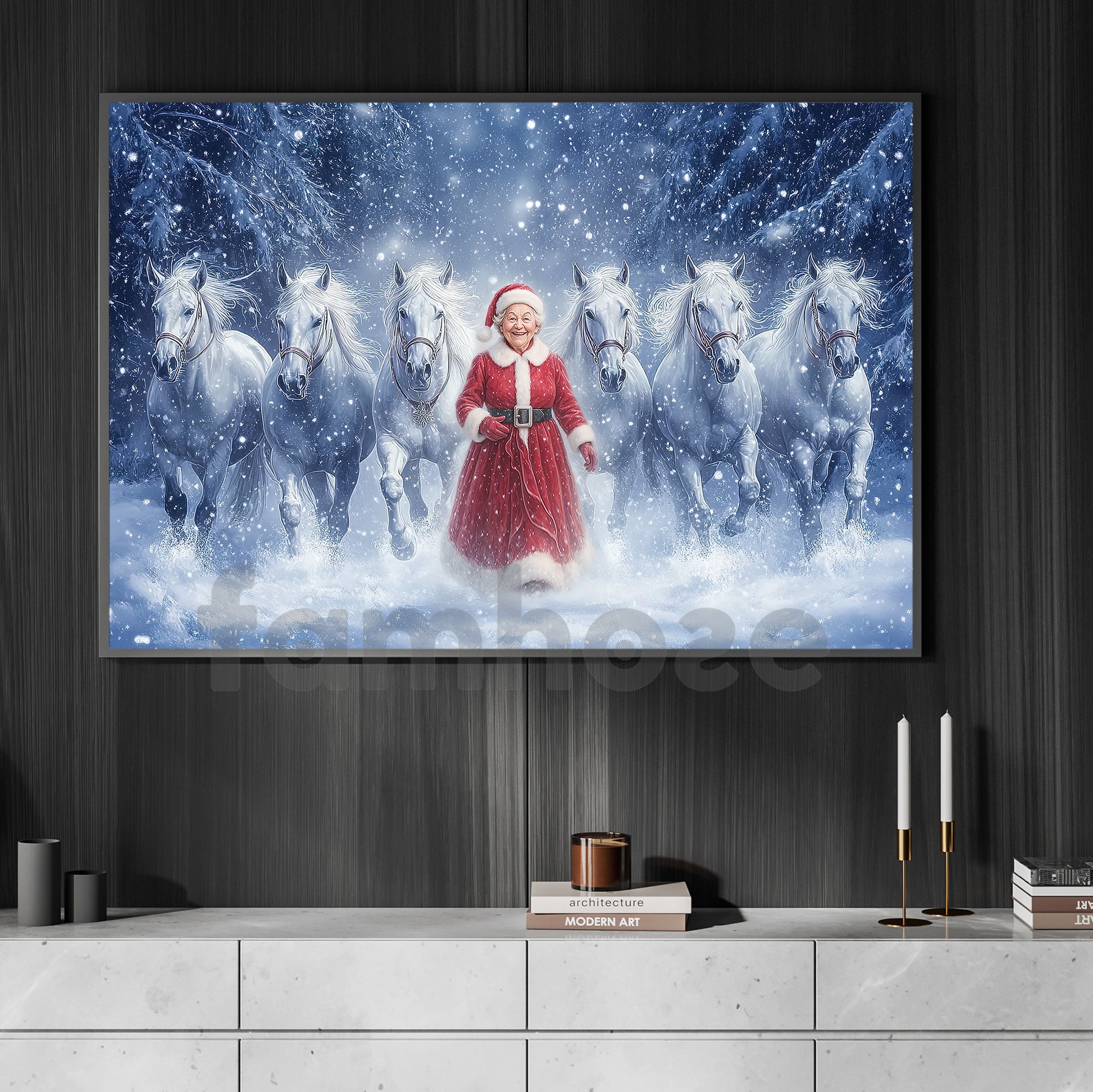 Christmas Santa Woman Canvas Painting, Santa Woman With White Horses Wall Art Decor, Xmas Poster Gift For Horse Lovers