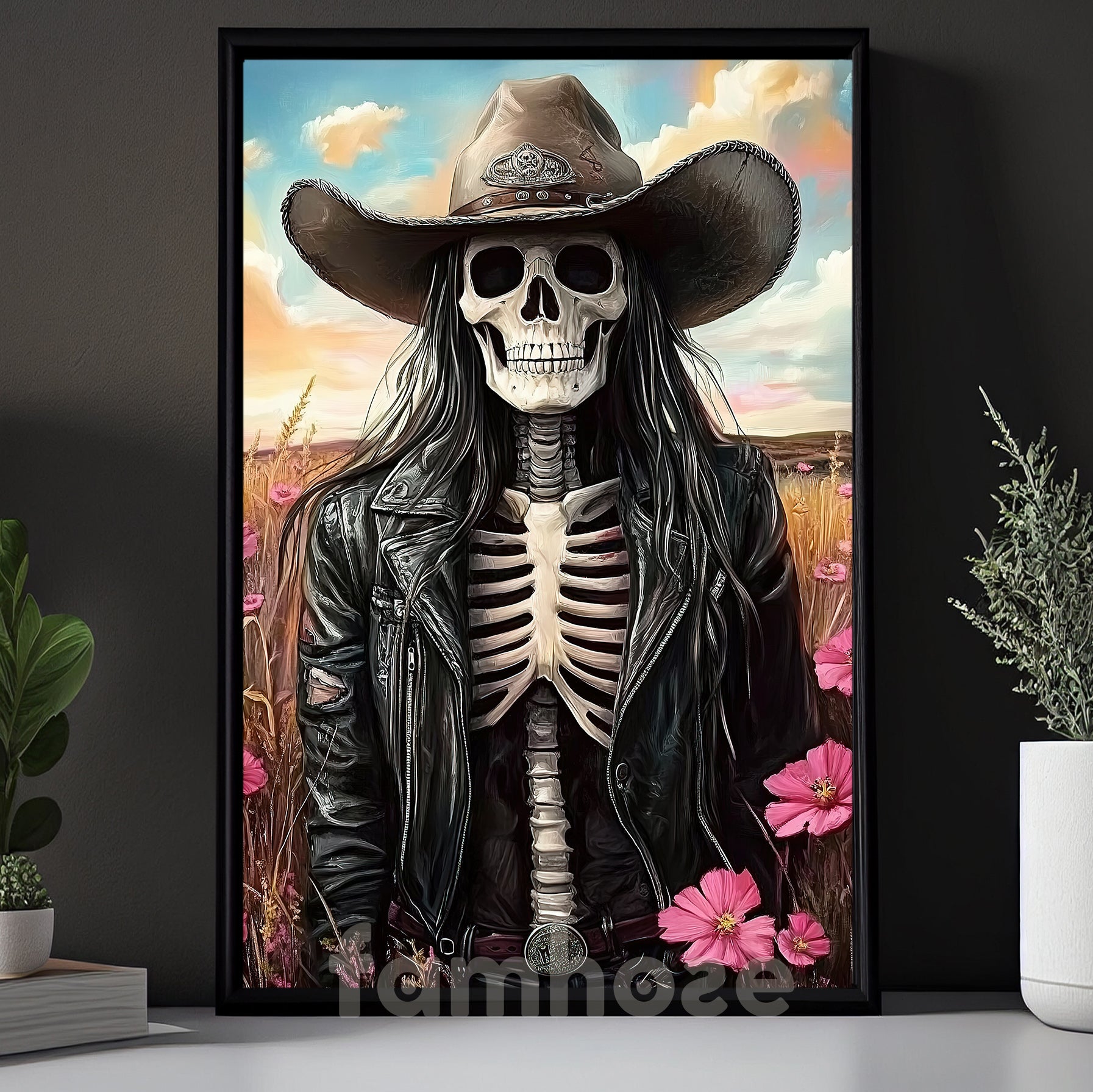 Cool Cowgirl Canvas Painting, Cowgirl Skeleton In Bloom Wall Art Decor, Poster Gift For Cowgirl Lovers
