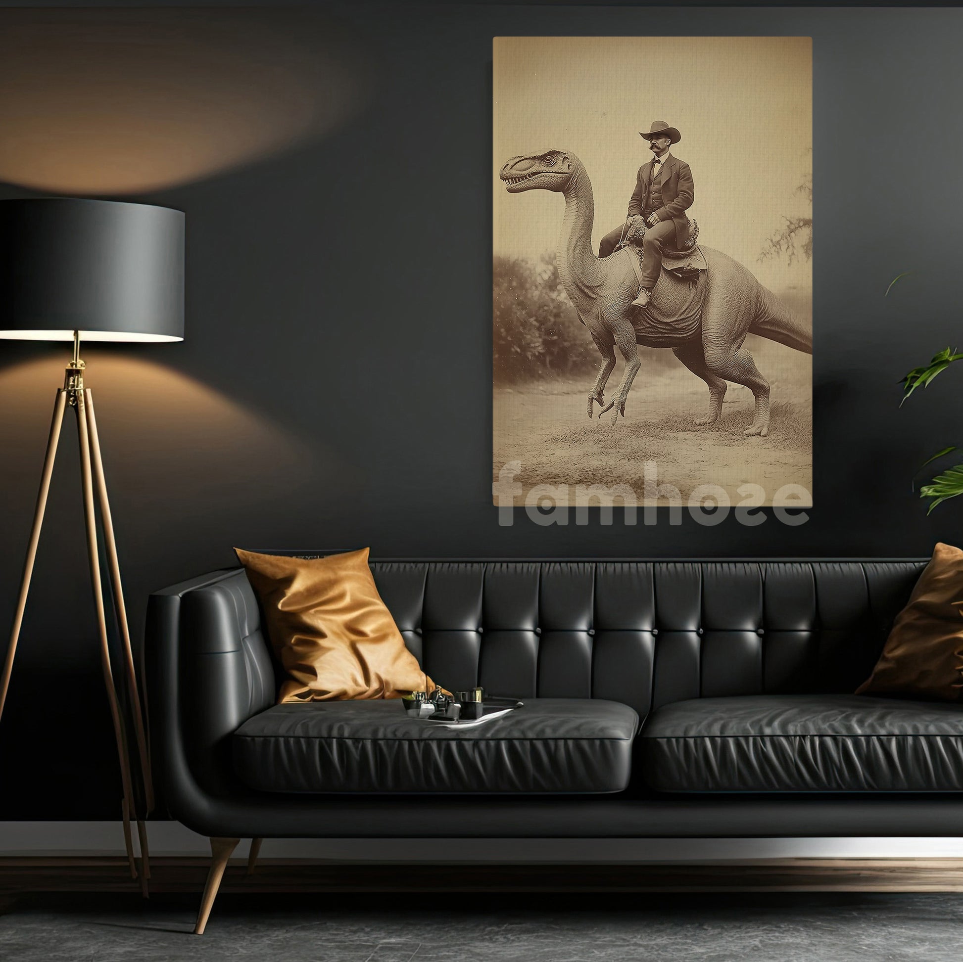 Cowboy Canvas Painting, Cowboy on a Dinosaur Adventure, Rodeo Wall Art Decor, Poster Gift For Cowboy Lovers