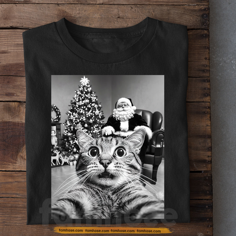 Funny Cat Selfie With Santa Christmas T-Shirt, Cute Cat Tee Xmas Gift For Cat Lovers
