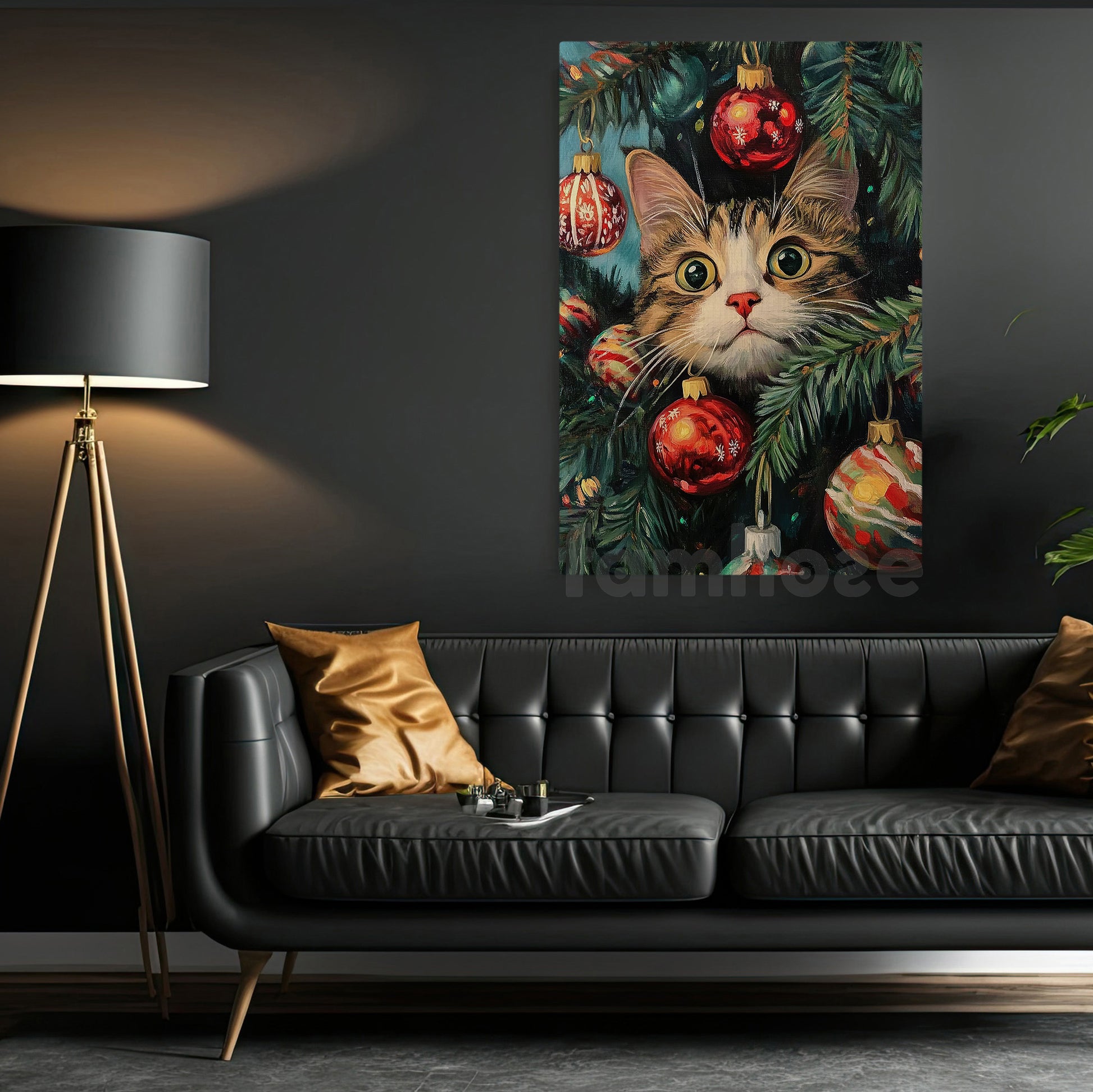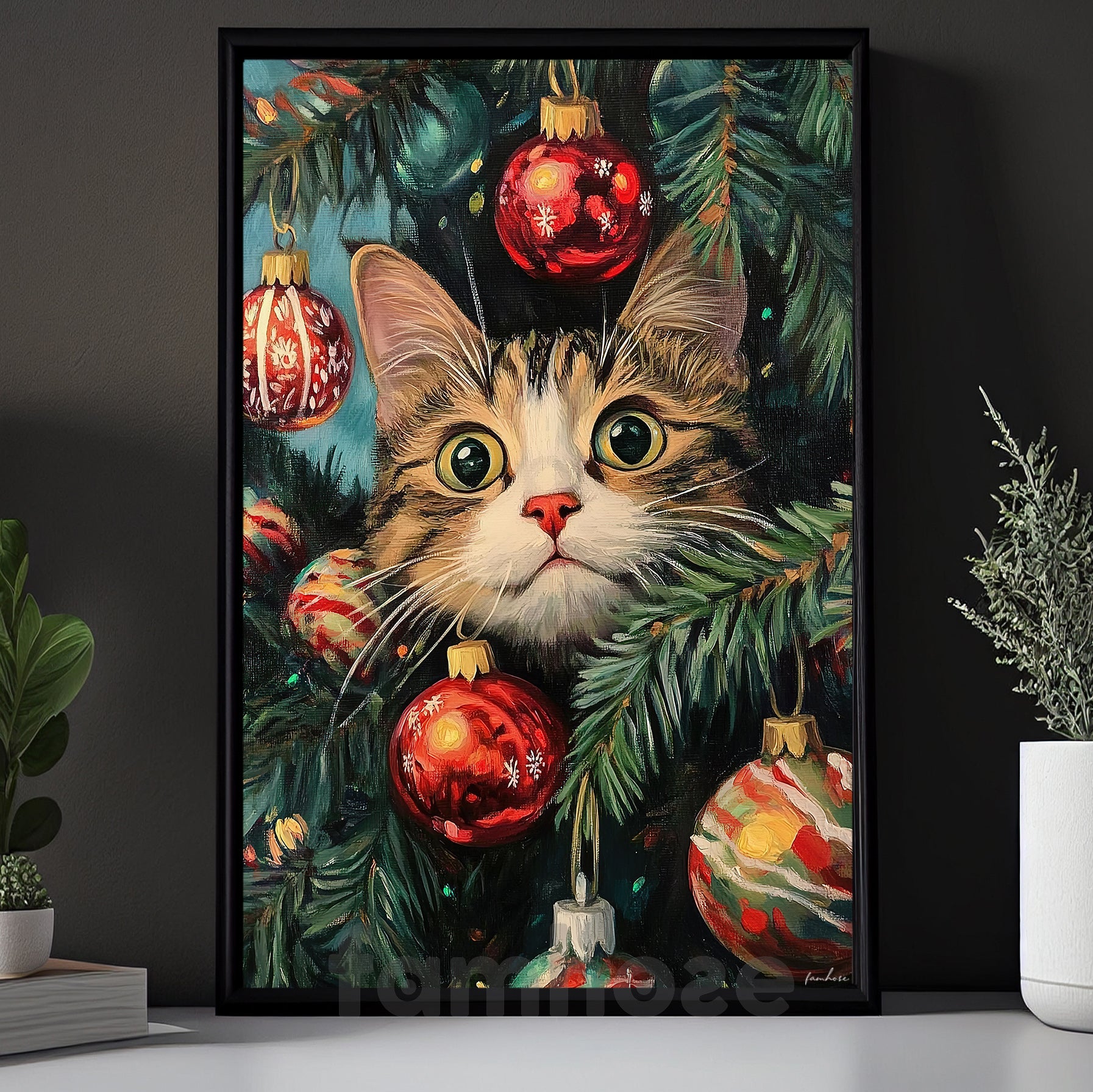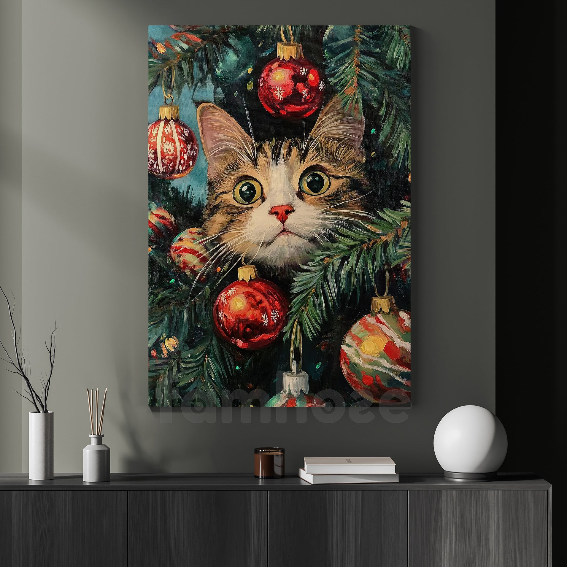 Funny Christmas Cat Canvas Painting, Curious Kitty In Tree Wall Art Decor Xmas Poster Gift For Cat Lovers