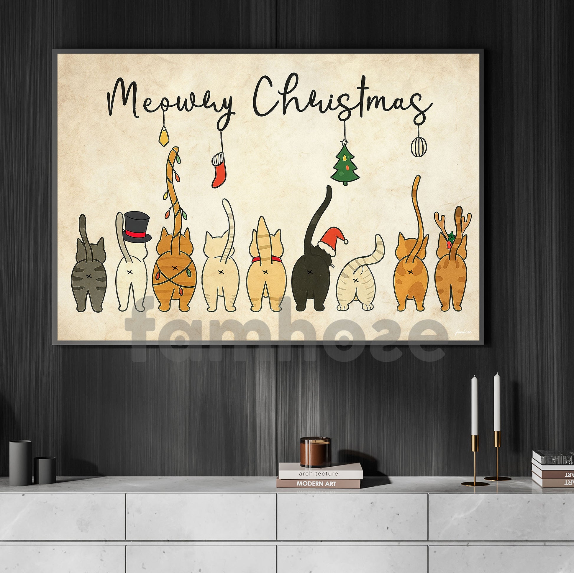 Funny Christmas Cat Canvas Painting, Meowy Christmas Wall Art Decor, Poster Gift For Cat Lovers