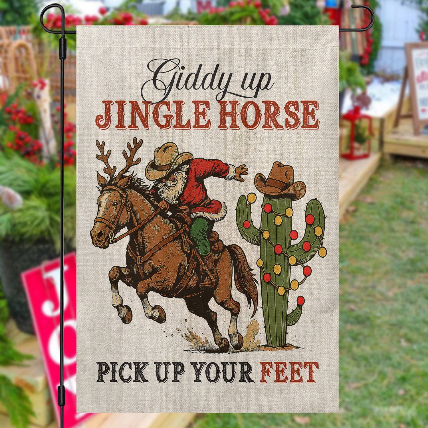 Funny Christmas Cowboy Rodeo Garden & House Flag, Giddy Up Jingle Horse Yard Flag, Xmas Gift For Cowboys