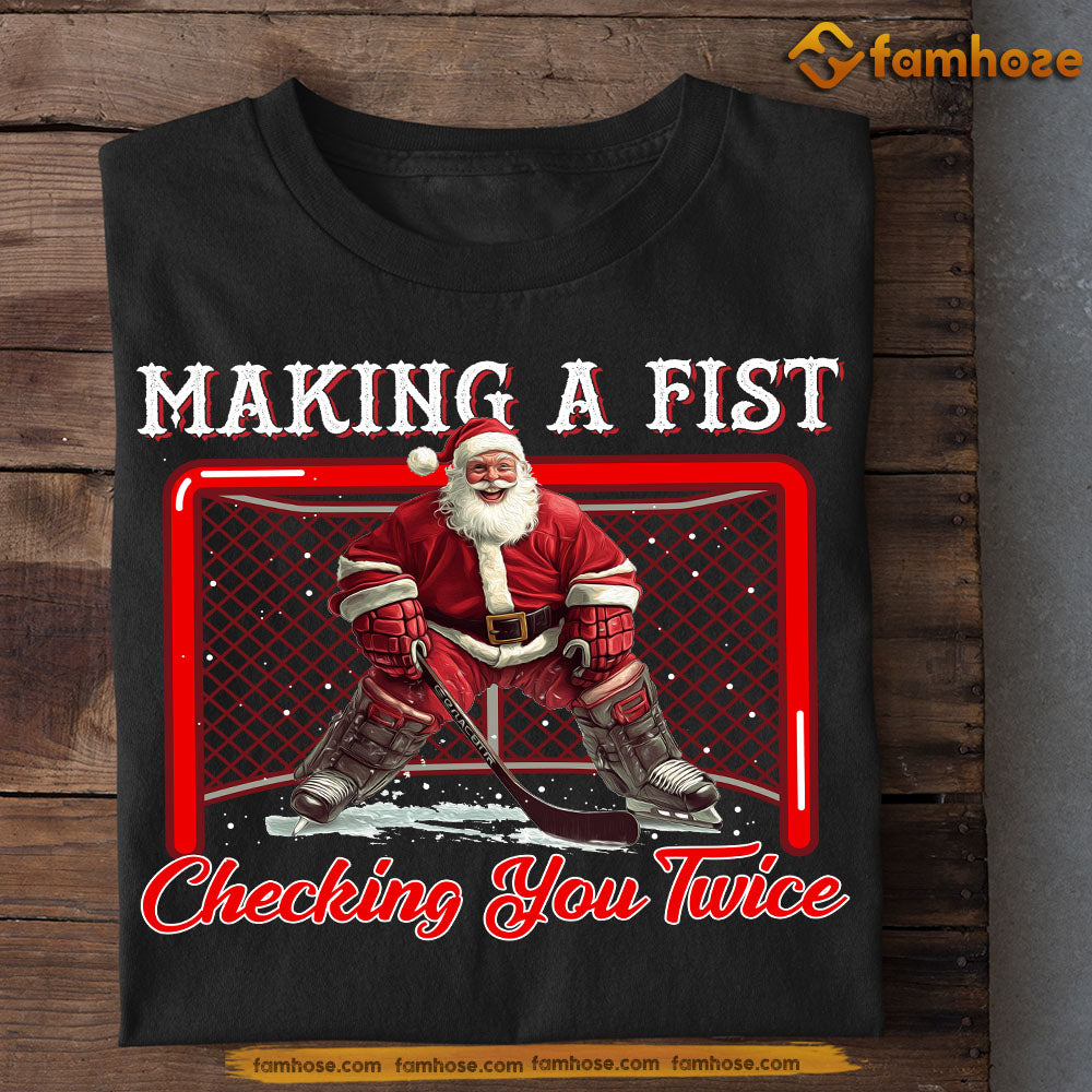 Funny Christmas Hockey T-shirt, Making A Fist Checking You Twice, Xmas Gift For Hockey Lovers