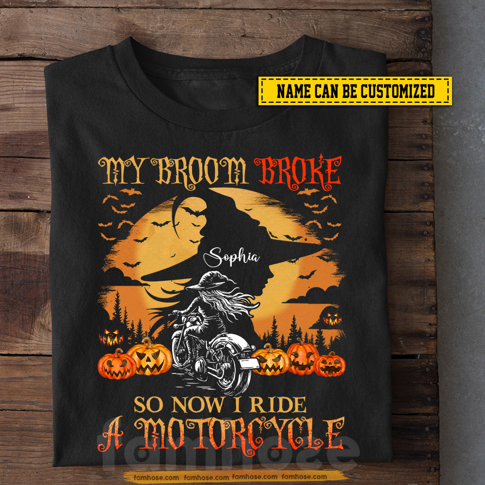 Funny Personalized Halloween Motorcycle Witch T-shirt, My Broom Broke Tees Spooky Season Gift For Biker