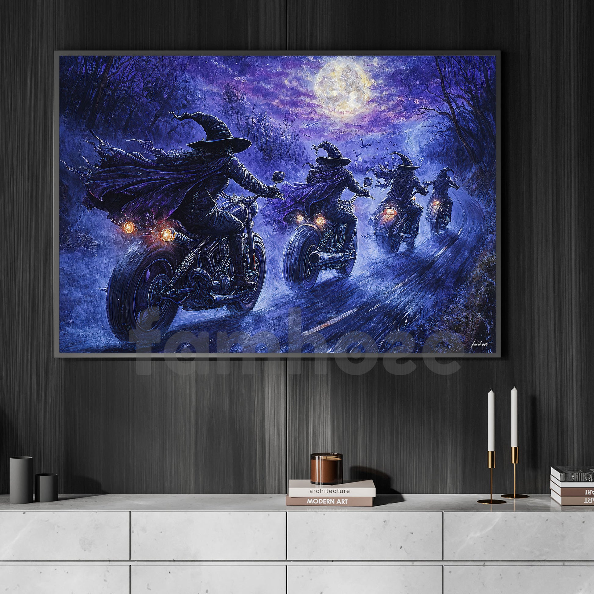 Halloween Motorcycle Witch Canvas Painting, Midnight Highway Coven Wall Art Decor, Spooky Season Poster Gift For Biker