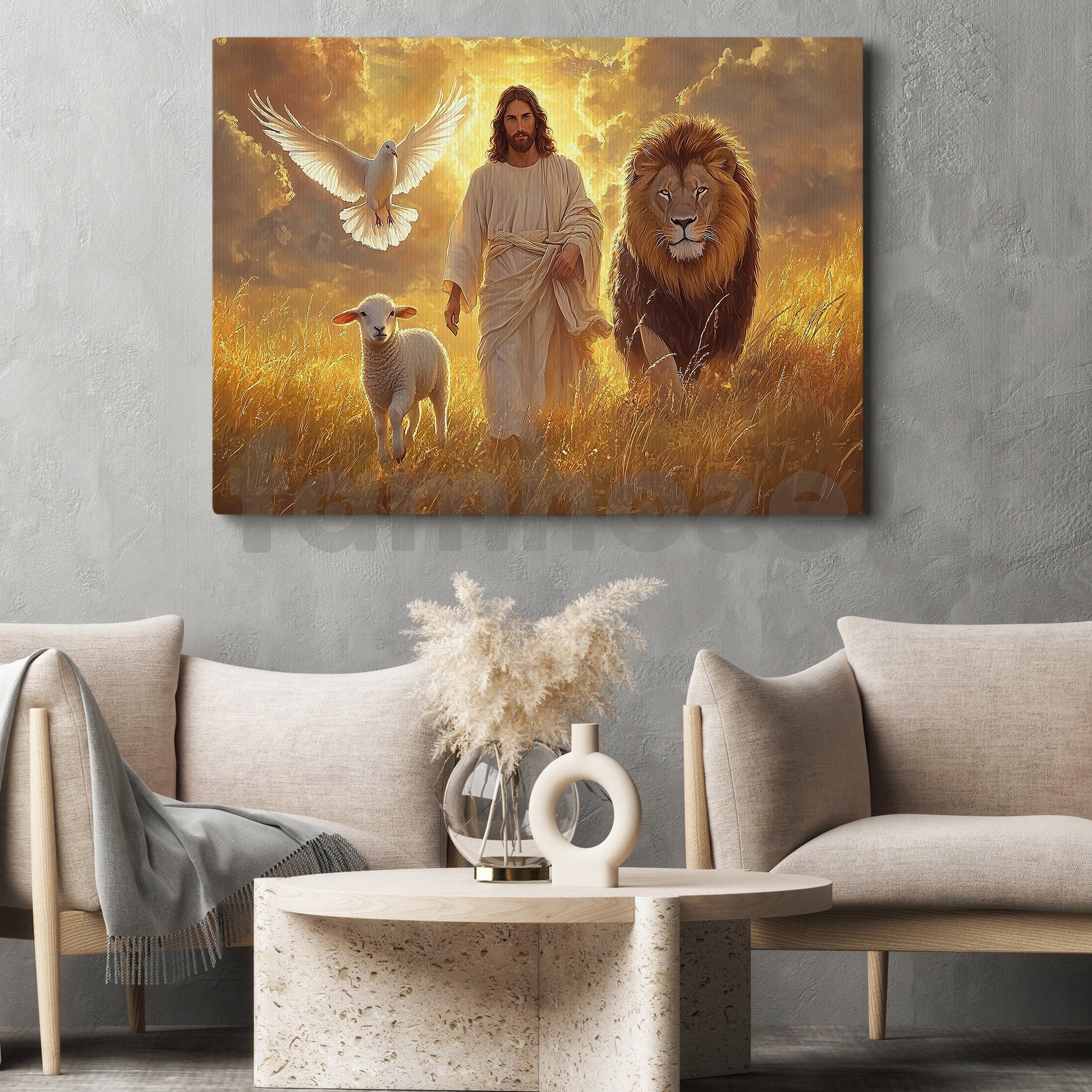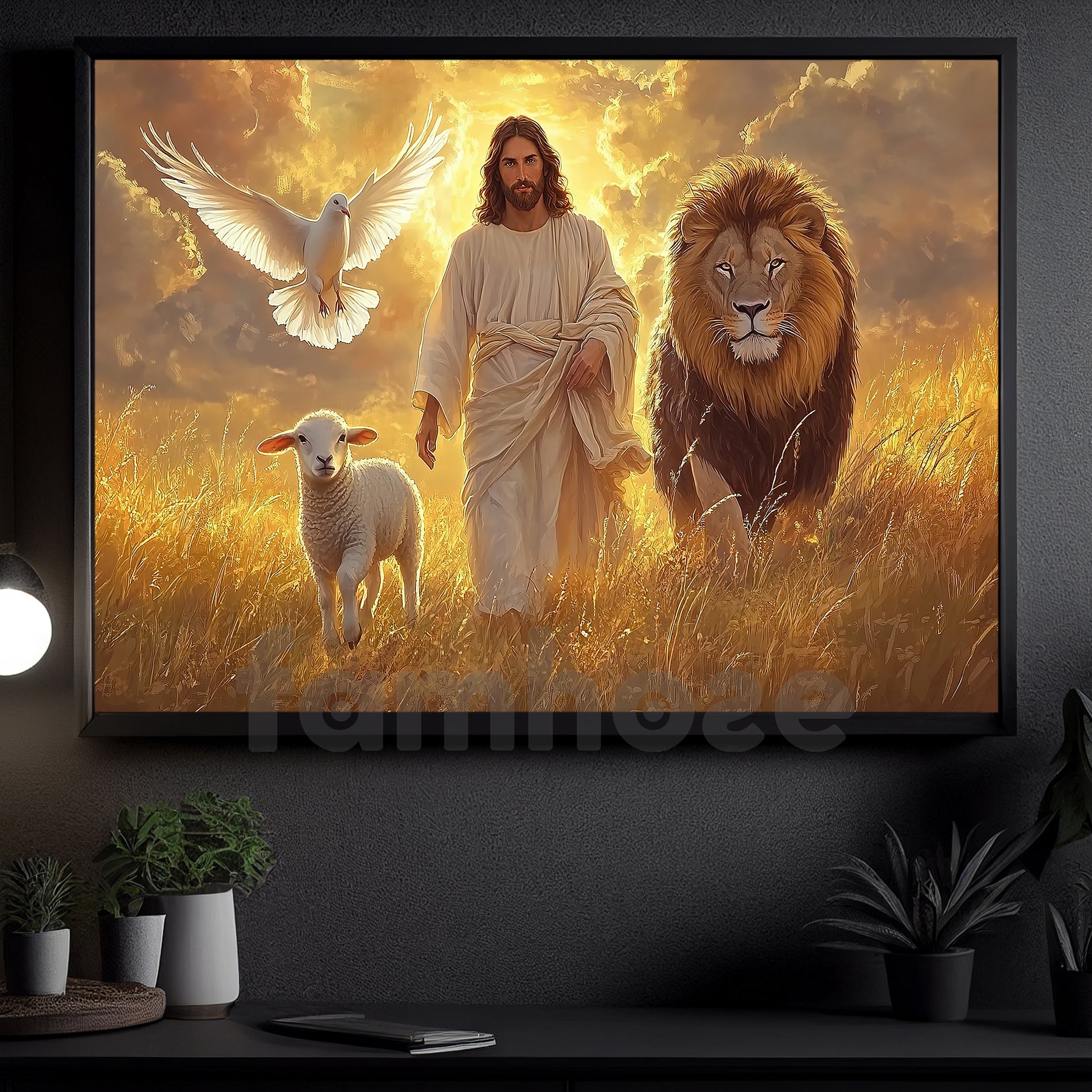 Jesus Canvas Painting, Walking In Divine Light With Lion Sheep & Bird Wall Art Decor, God Poster Gift For Christian