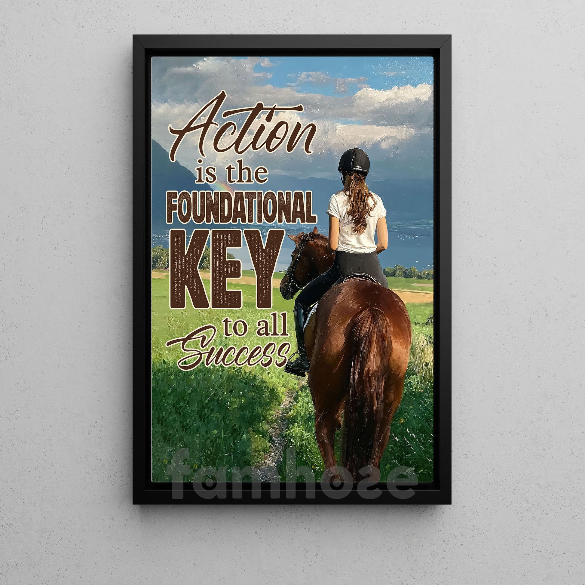 Motivational Horse Riding Girl Canvas Painting, Action Is Foundational Key Inspirational Quotes Wall Art Decor, Poster Gift For Horse Girl
