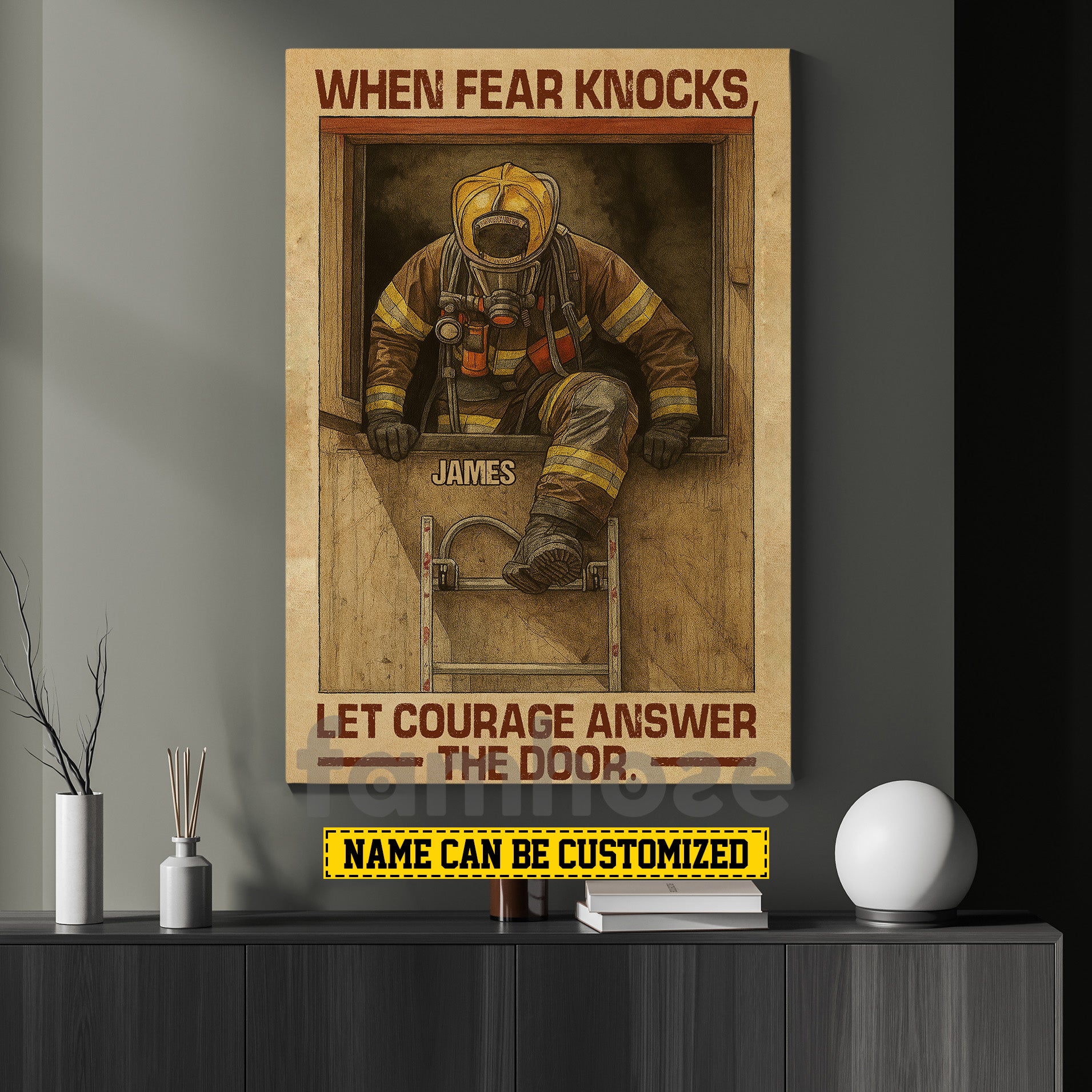 Motivational Personalized Firefighter Canvas Painting, When Fear Knocks Inspirational Quotes Wall Art Decor, Poster Gift For Firefighter Lovers