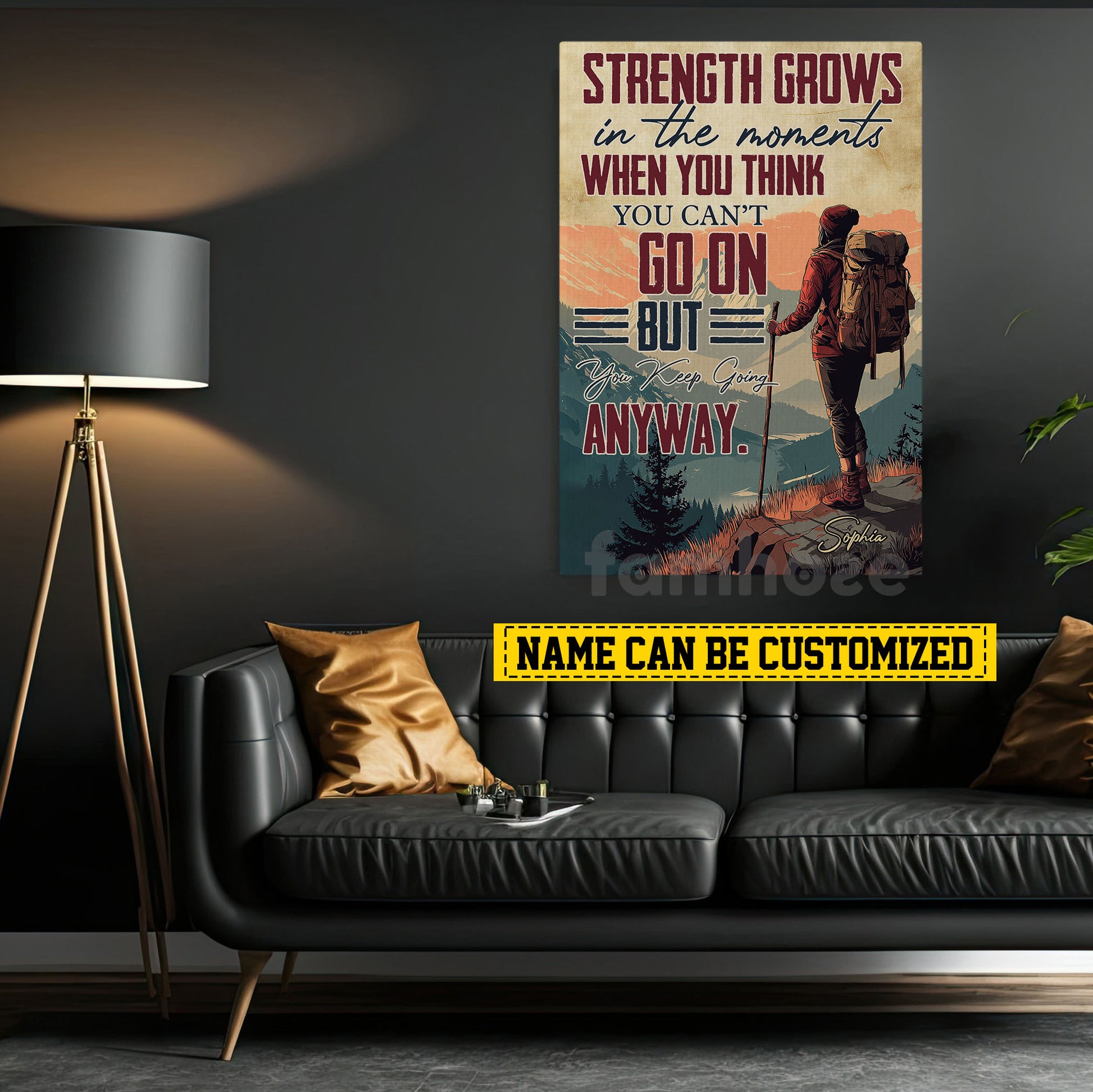 Motivational Personalized Hiking Woman Canvas Painting, Strength Grows In The Moment Sport Wall Art Decor, Poster Gift For Hiking Lovers