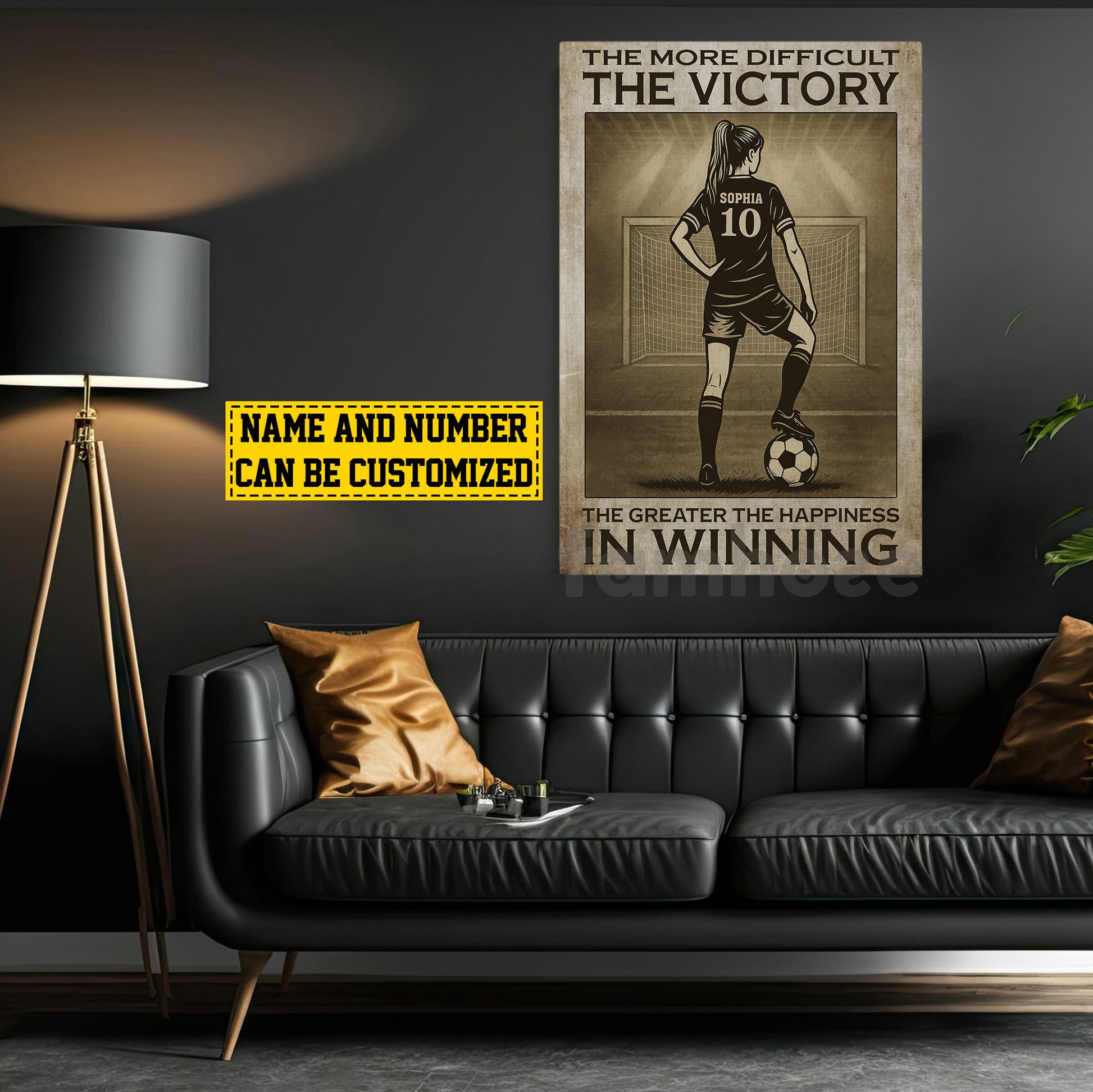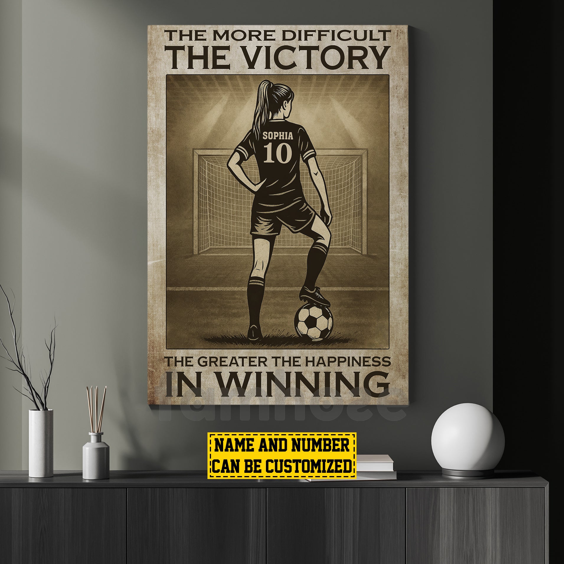 Motivational Personalized Soccer Woman Canvas Painting, The More Difficult The Victory Sports Wall Art Decor, Poster Gift For Soccer Lovers