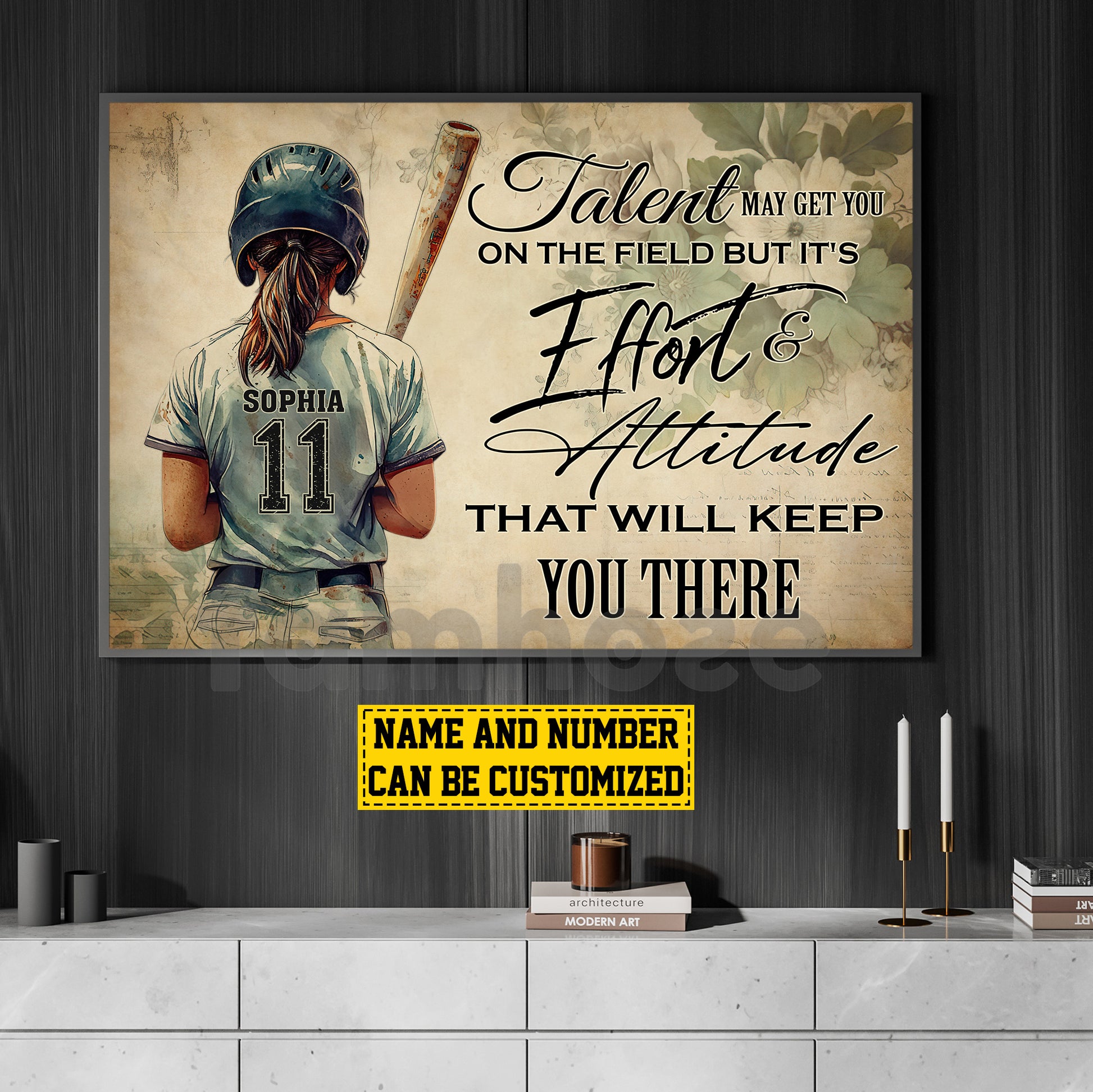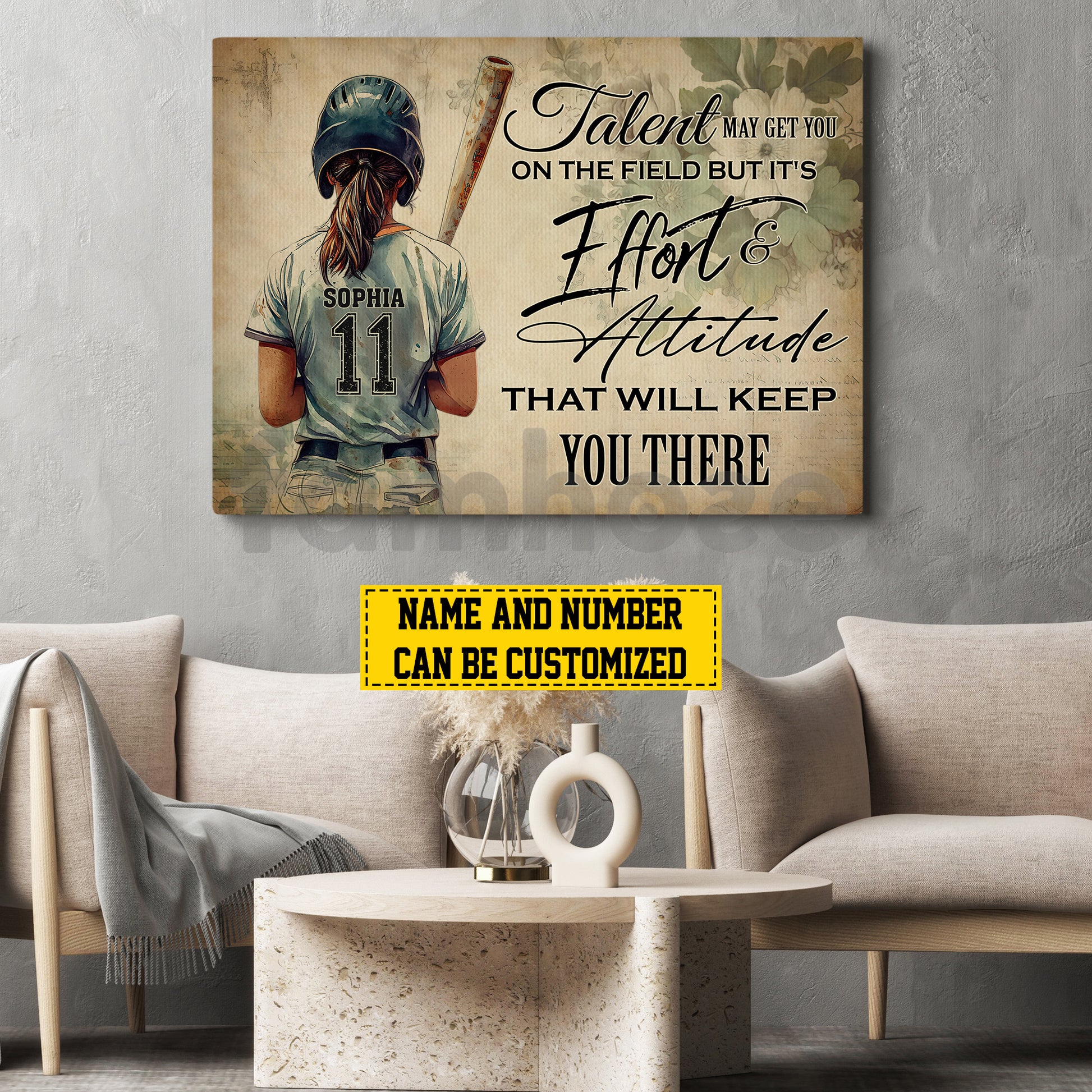 Motivational Personalized Softball Girl Canvas Painting, Talent May Got You On The Field Sport Wall Art Decor, Poster Gift For Softball Lovers