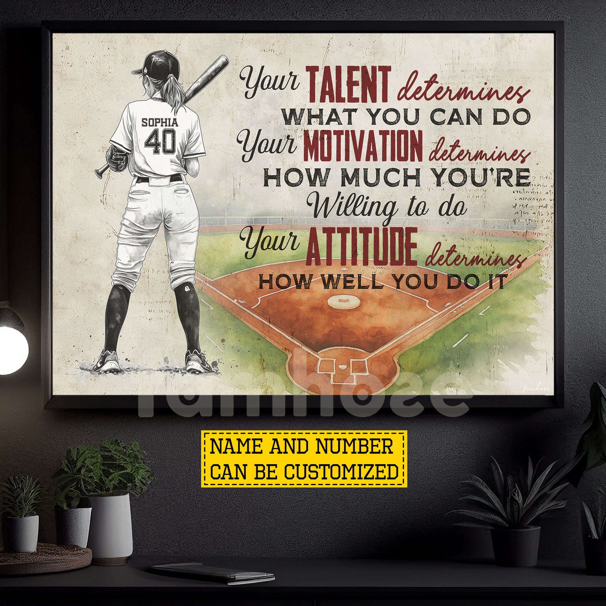 Motivational Personalized Softball Girl Canvas Painting, Your Talent Determines What You Can Do Sport Wall Art Decor, Poster Gift For Softball Lover