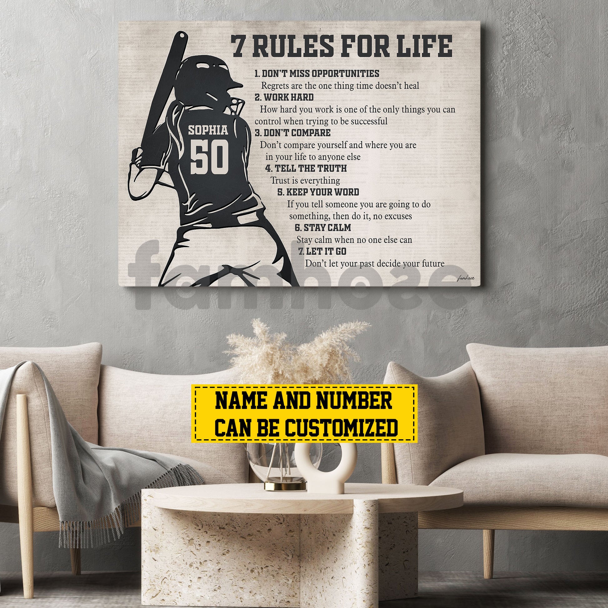 Motivational Personalized Softball Woman Canvas Painting, 7 Rules For Life Sport Wall Art Decor, Poster Gift For Softball Lovers