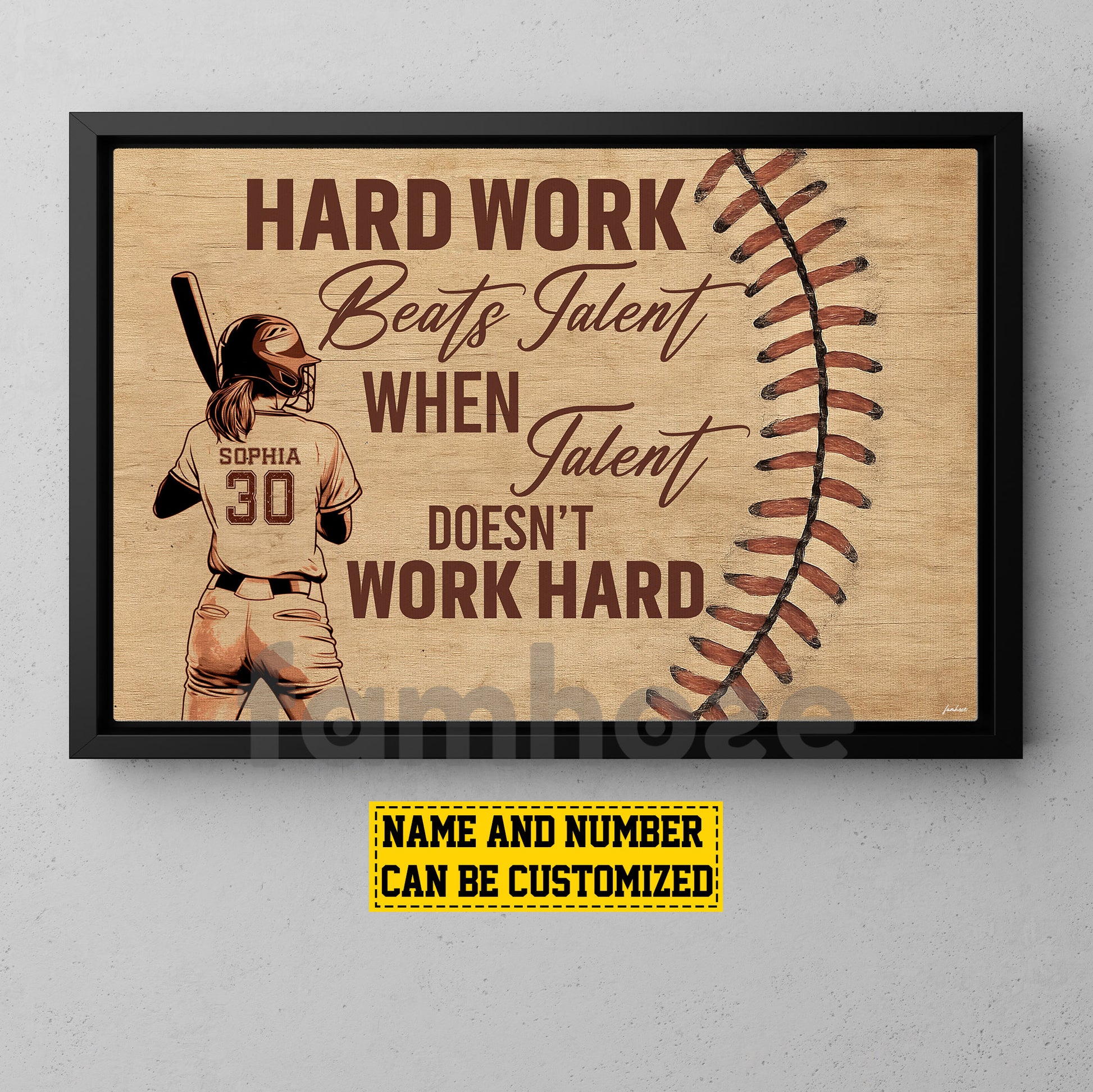 Motivational Personalized Softball Woman Canvas Painting, Hard Work Beats Talent Wall Art Decor, Poster Gift For Softball Lovers
