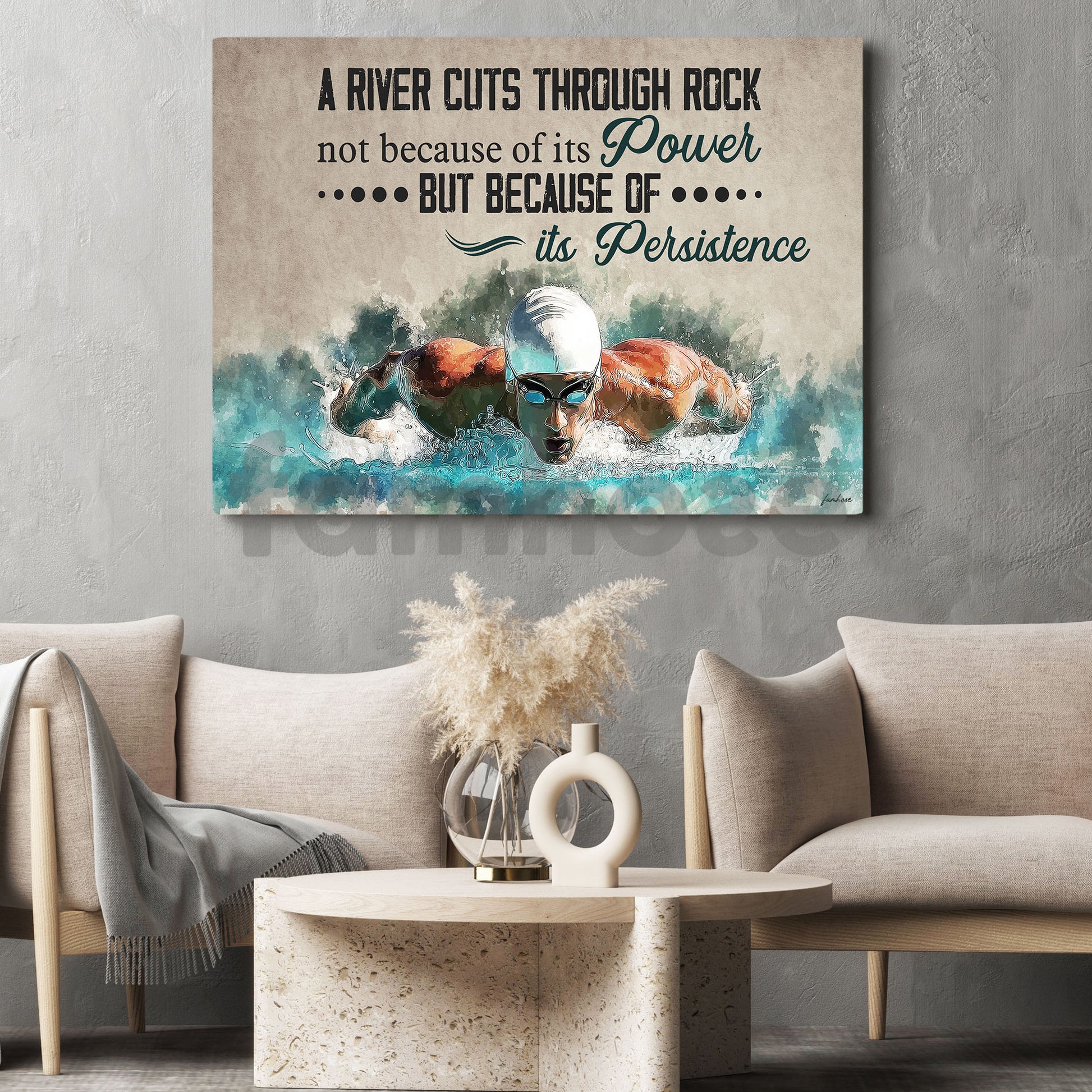 Motivational Swimming Man Canvas Painting, A RIver Cuts Through Rock Sport Wall Art Decor, Poster Gift For Swimming Lovers