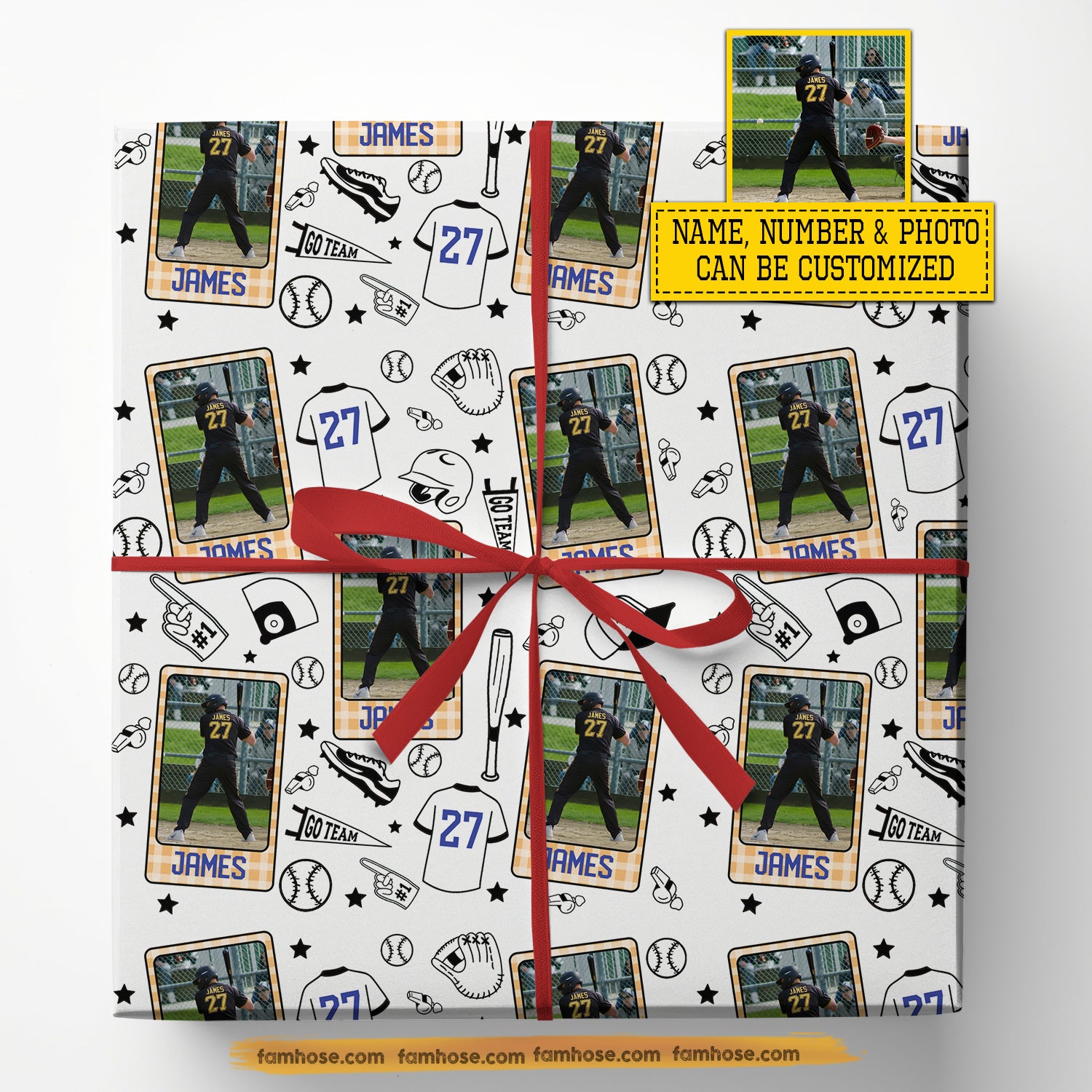 Personalized Christmas Baseball Wrapping Paper, Custom Sports Go Team In White Background Wrapping Paper Rolls, Xmas Gift Wrap For Baseball Lover