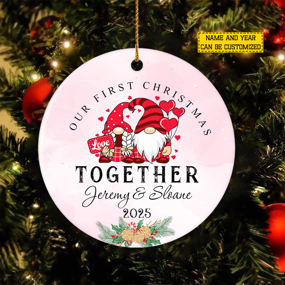 Personalized Christmas Couple Gnomes Ornament, Our First Christmas Together Xmas Circle Ceramic Ornament Gift For Couple