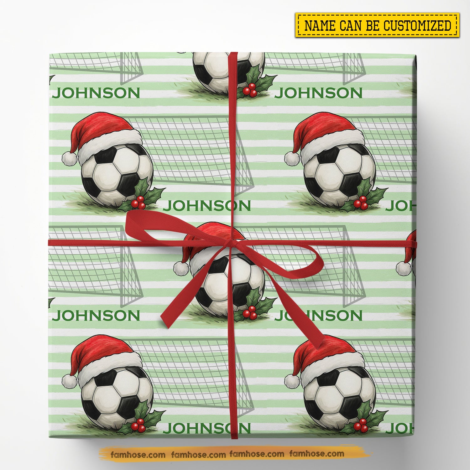Personalized Christmas Soccer Wrapping Paper, Ball Wears Santa Hat In Light Green Background Wrapping Paper Rolls, Xmas Gift Wrap For Soccer Lover