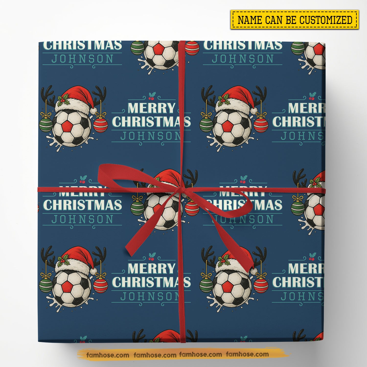 Personalized Christmas Soccer Wrapping Paper, Balls Wearing Santa Hat Wrapping Paper Rolls, Xmas Gift Wrap For Soccer Lover
