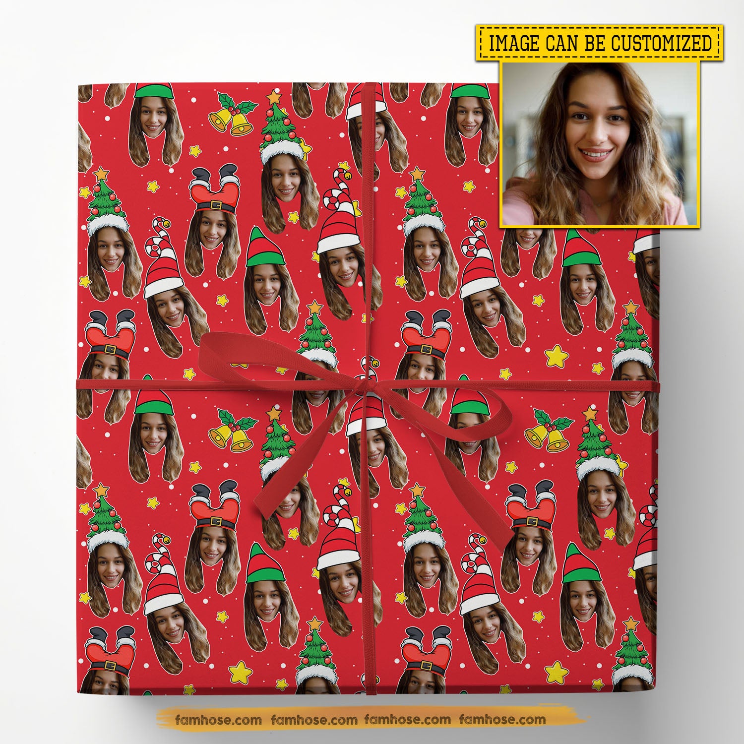 Personalized Christmas Tree Wrapping Paper, Funny Custom Yourself In Red Background Wrapping Paper Rolls Xmas Gift