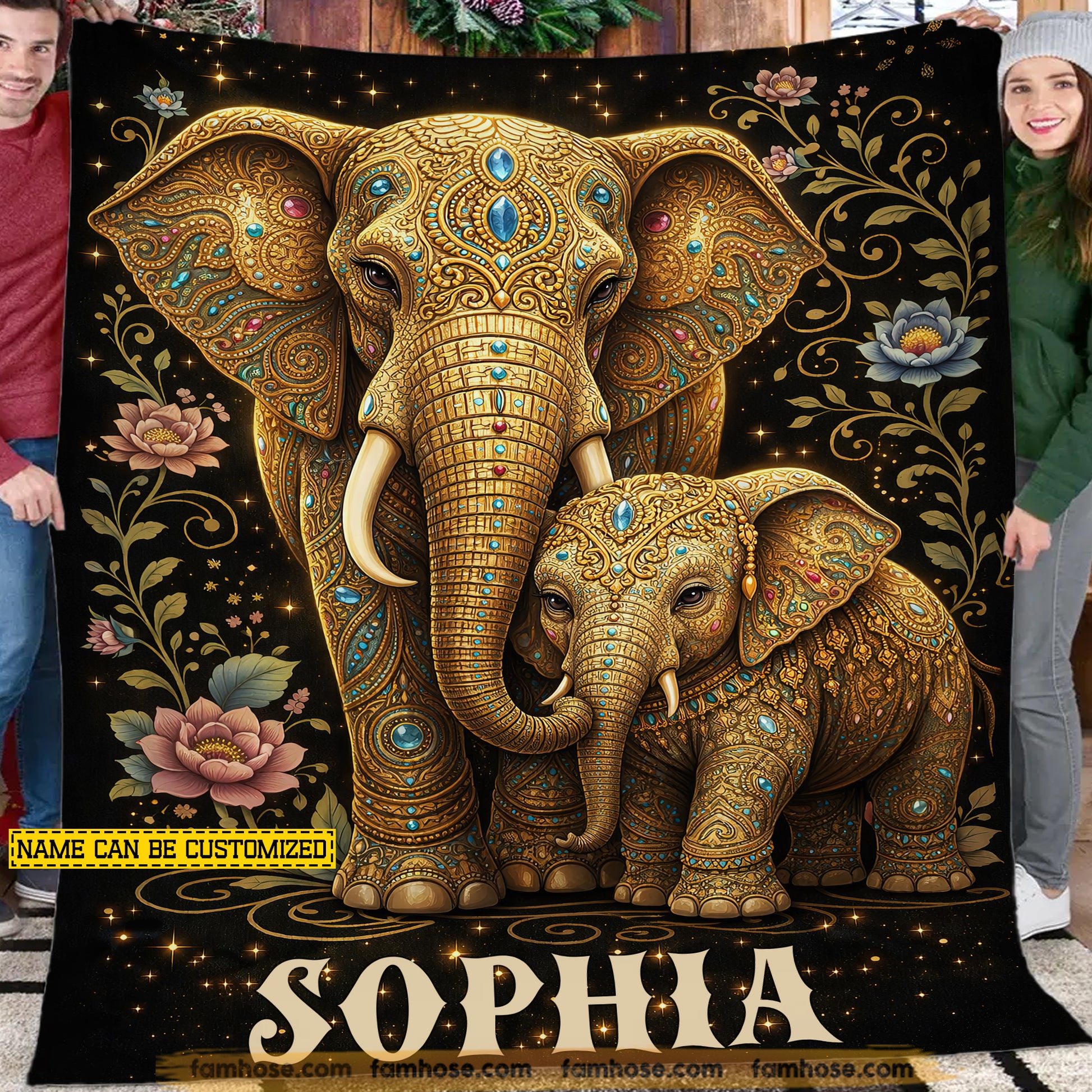 Personalized Elephant Fleece Blanket, Golden Elephant Mother And Baby Woven Blanket, Sherpa Blanket Gift For Elephant Lover