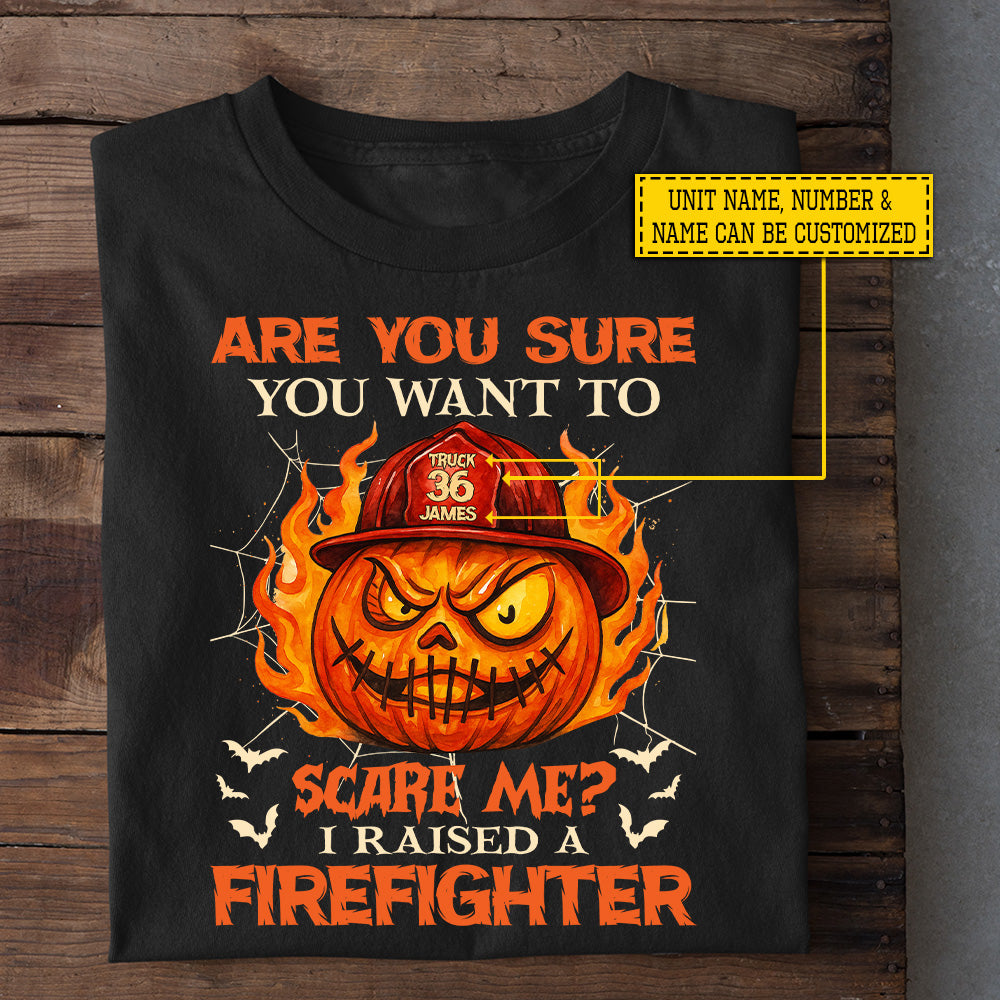 Personalized Halloween Firefighter Pumpkin T-shirt, Are You Sure You Want To Scare Me Tees Spooky Season Gift For Firefighter Lovers
