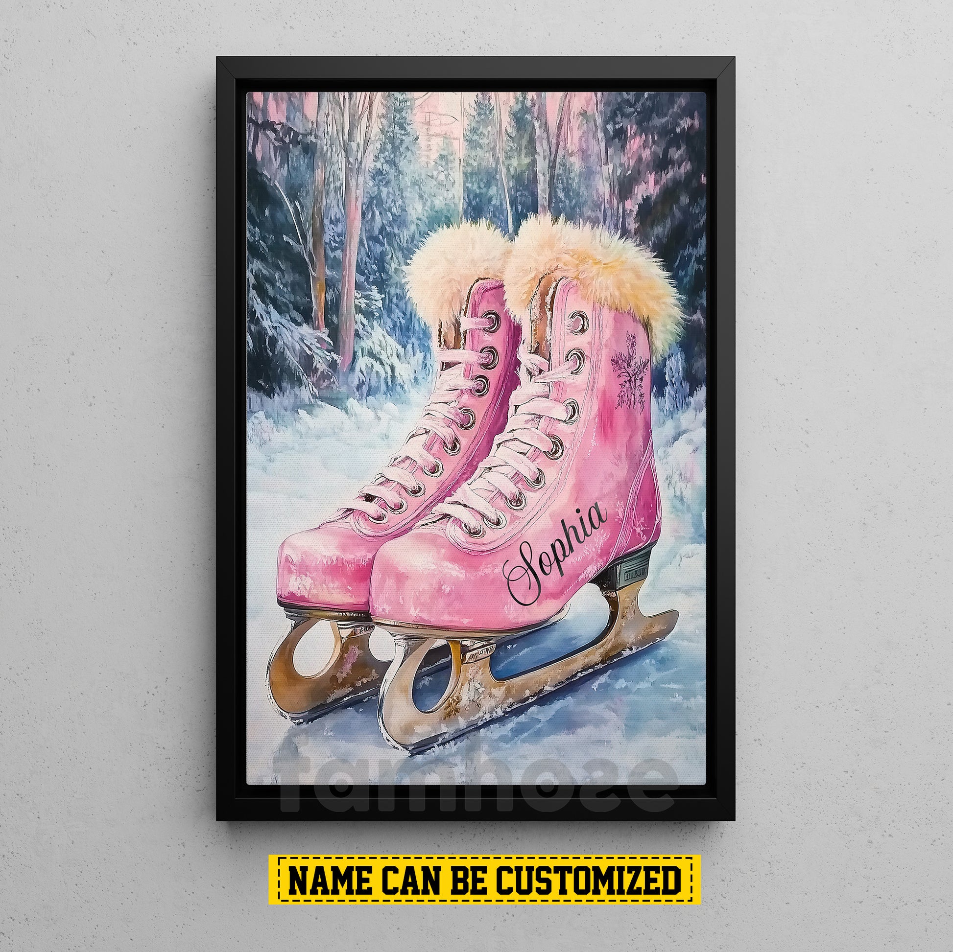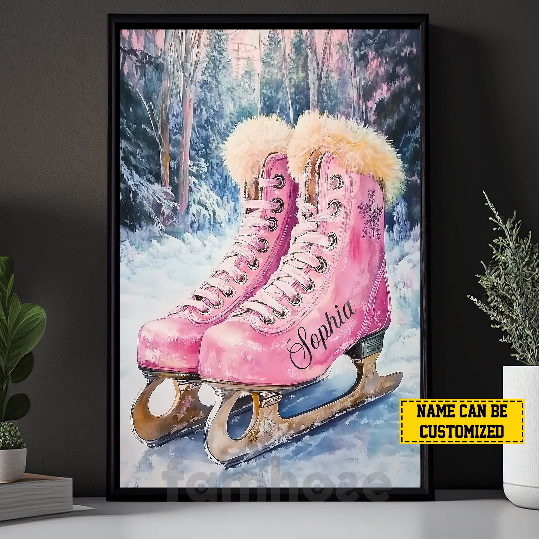 Personalized Ice Skating Canvas Painting, Pink Ice Skates Wall Art Decor, Poster Gift For Ice Skating Lovers