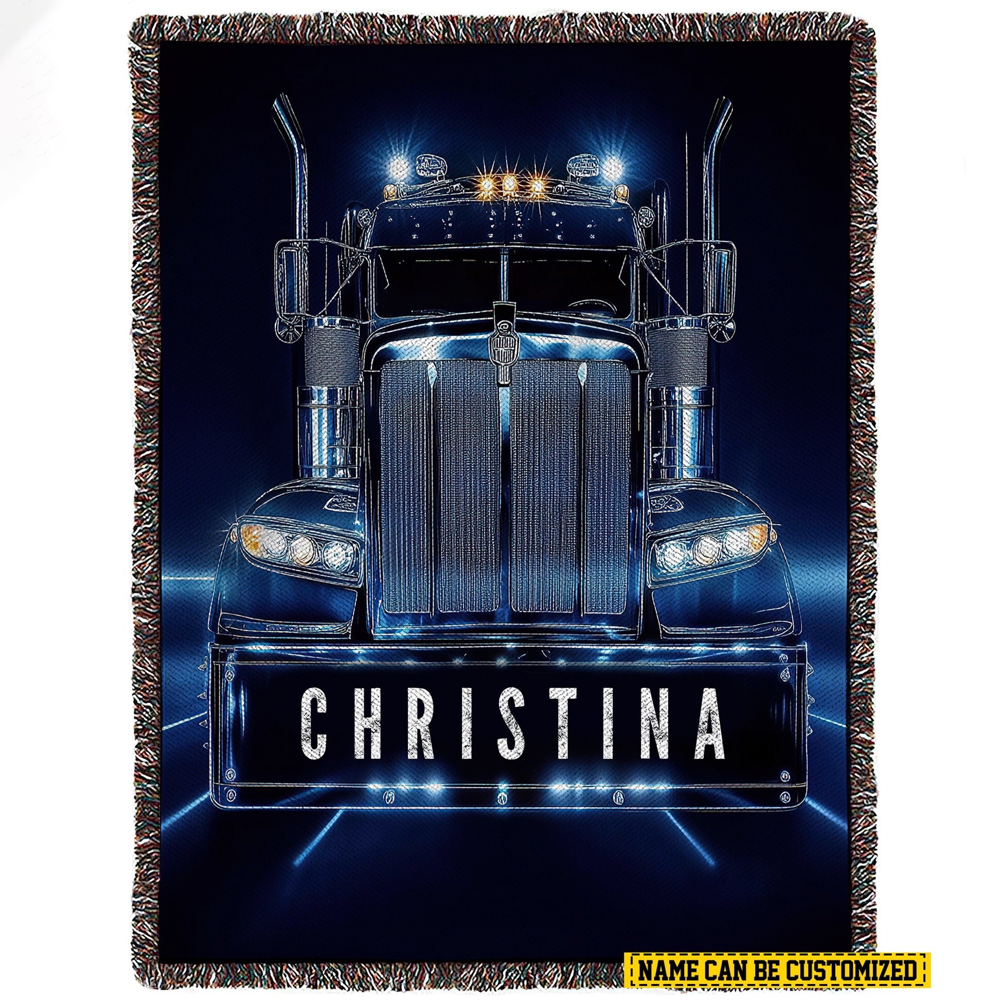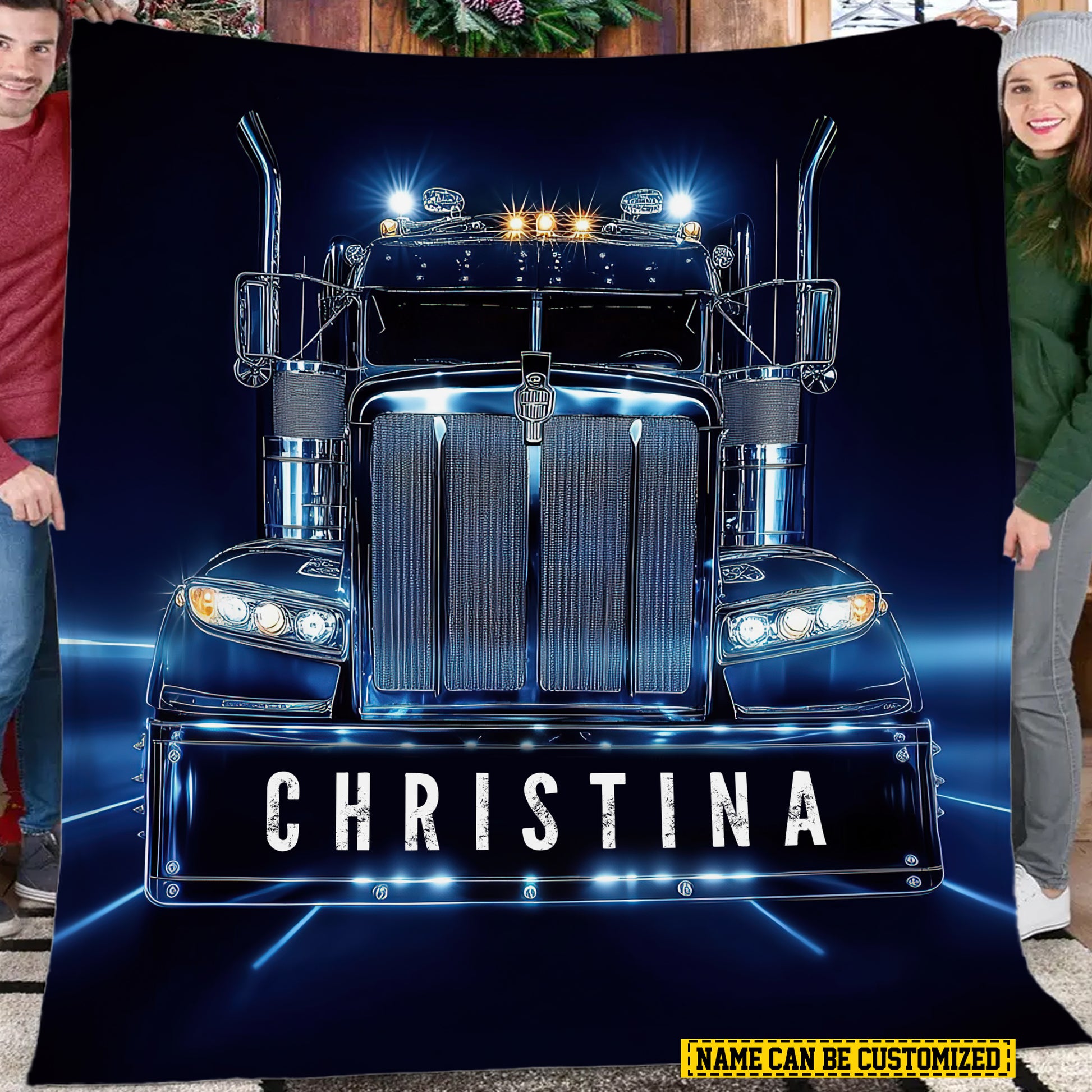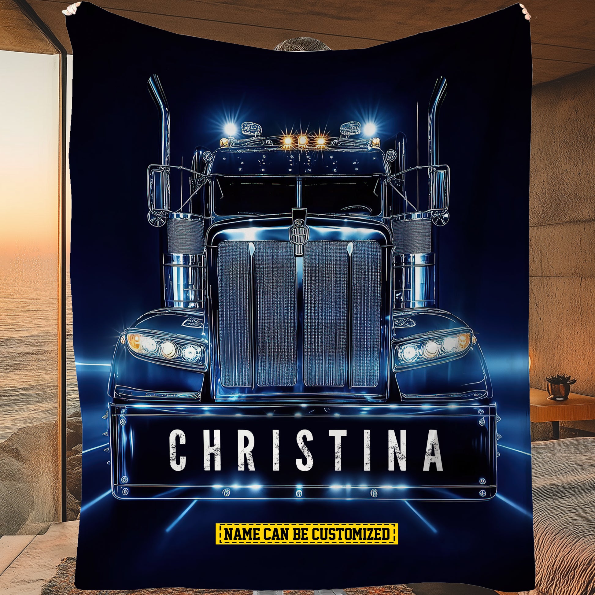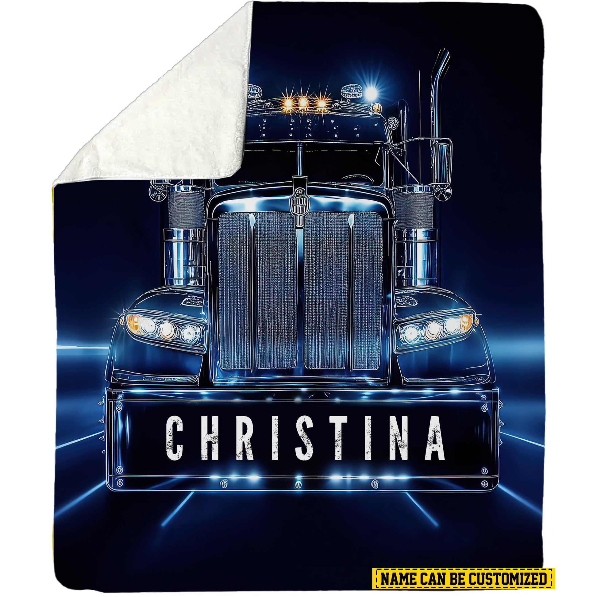 Personalized Trucker Fleece Blanket, Big Truck In Night Woven Blanket, Cool Sherpa Blanket Gift For Truck Drivers