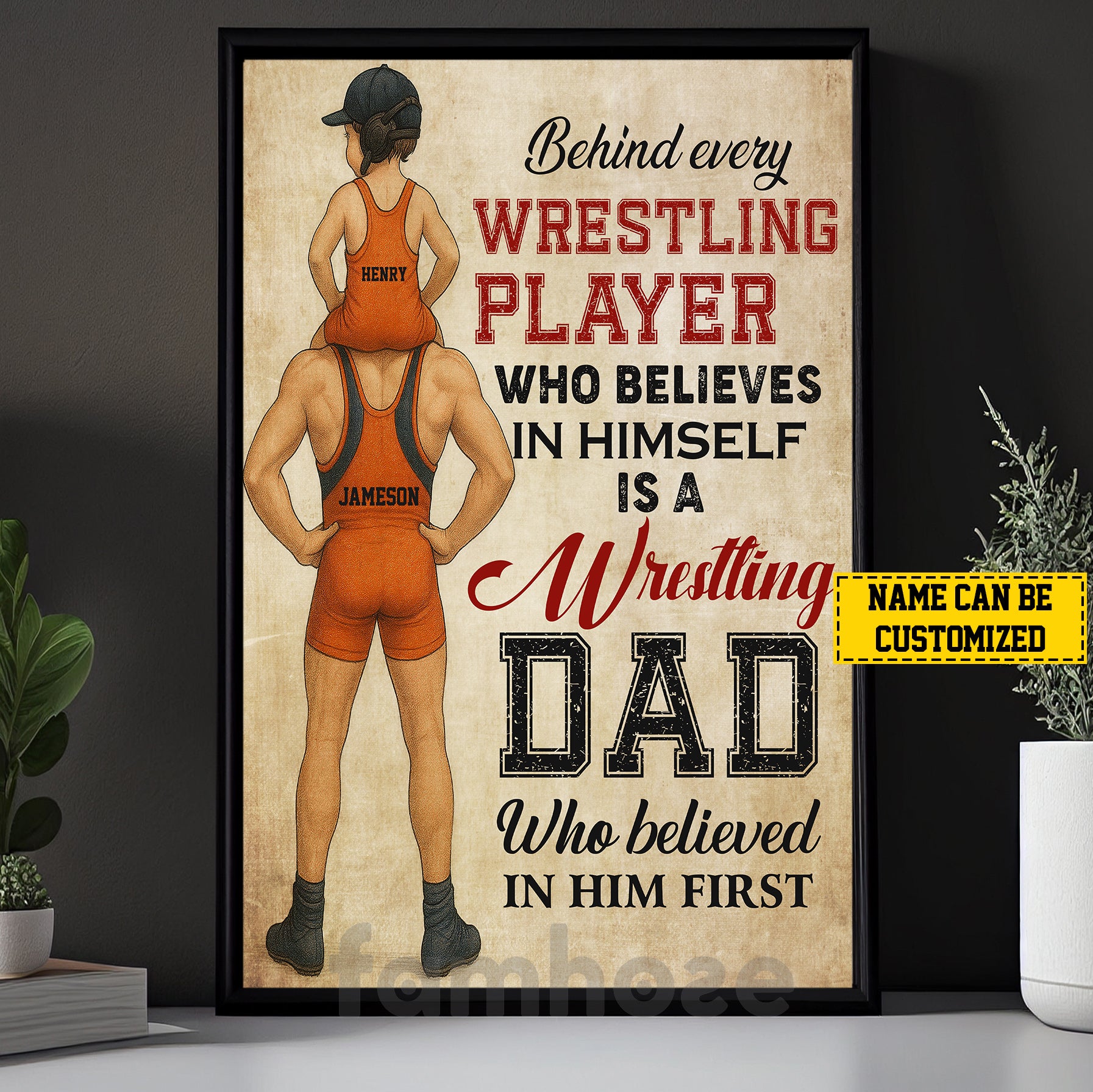 Personalized Wrestling Dad Son Canvas Painting, Behind Every Wrestling Player, Sports Wall Art Decor, Father's Day Poster Gift For Wrestling Lovers
