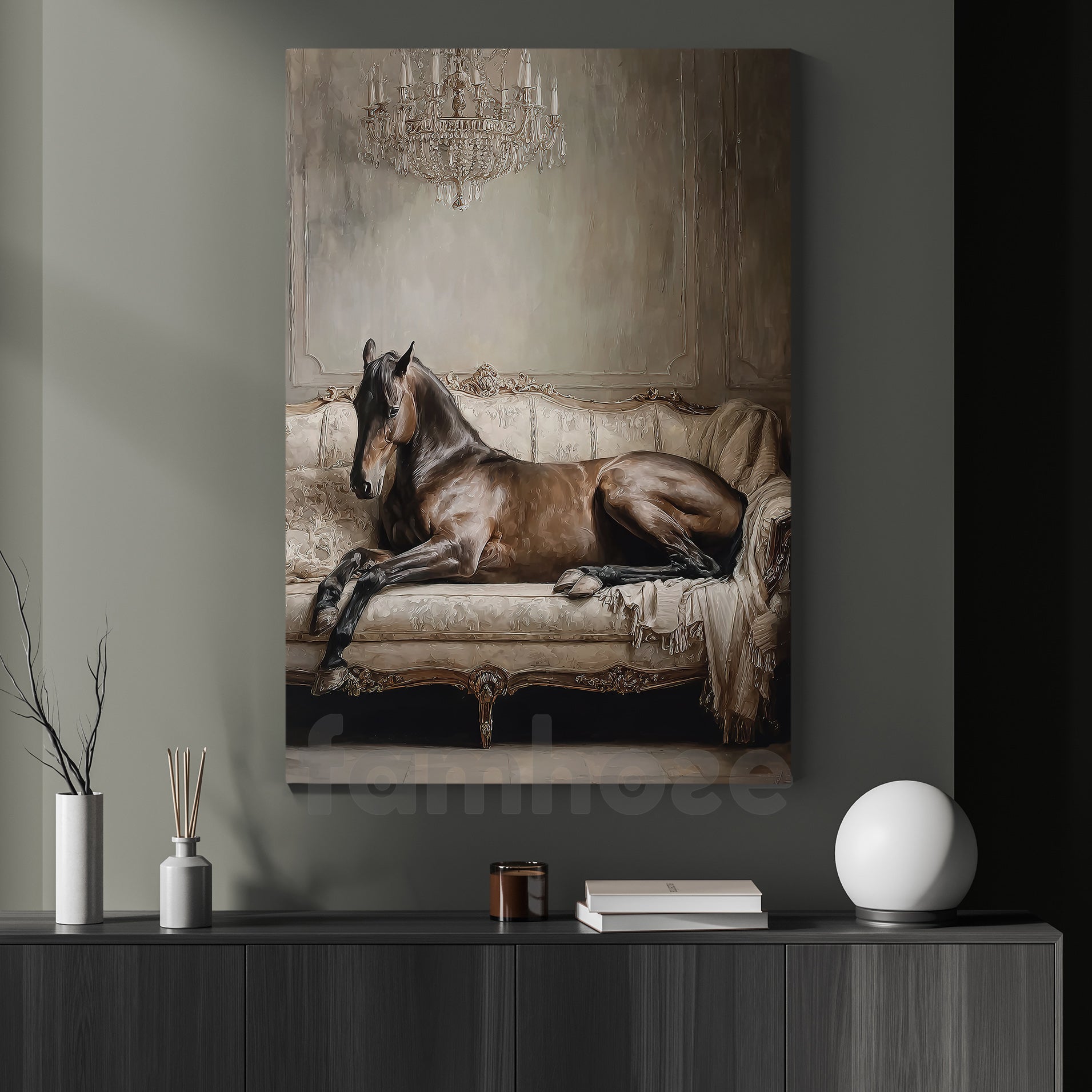 Regal Horse Canvas Painting, Horse Lying Baroque Sofa Wall Art Decor, Poster Gift For Horse Lovers