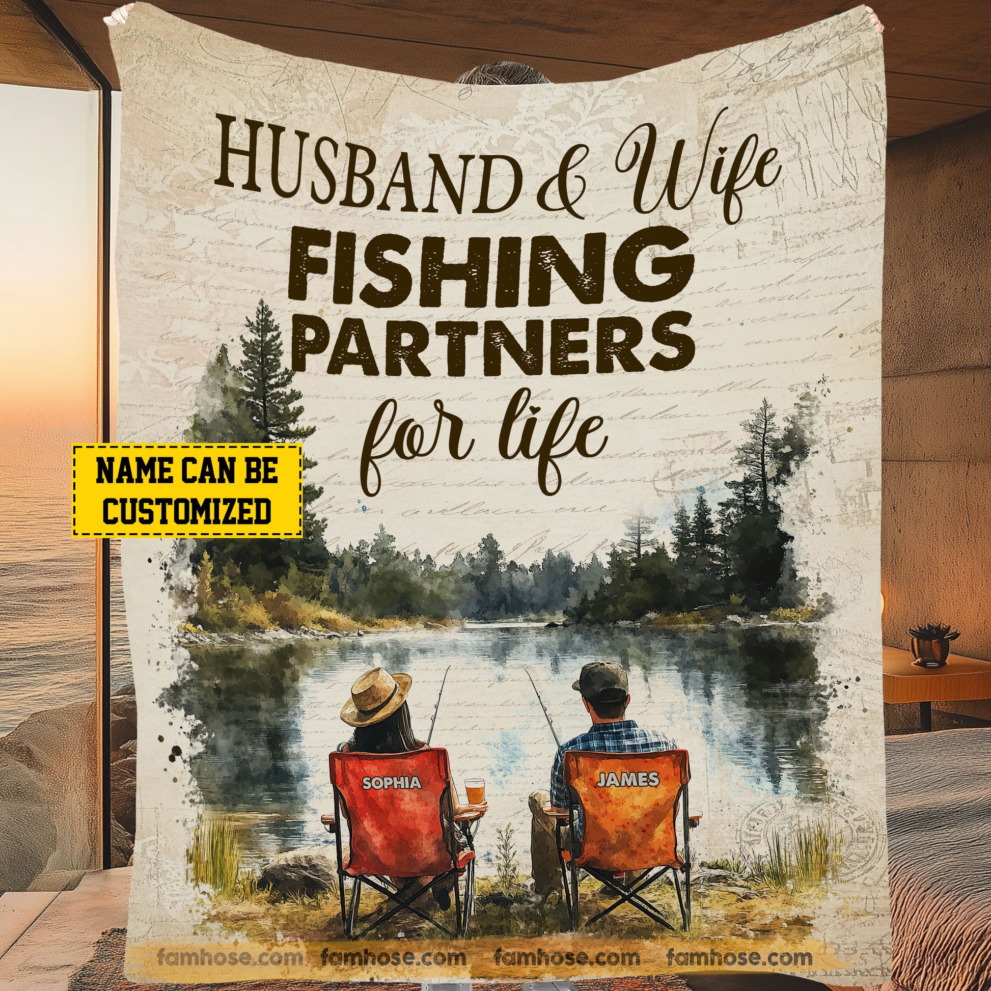 Romantic Personalized Fishing Couple Fleece Blanket, Husband & Wife Fishing Partners For Life Woven Blanket, Cool Sherpa Blanket Gift For Fishing-Loving Couple
