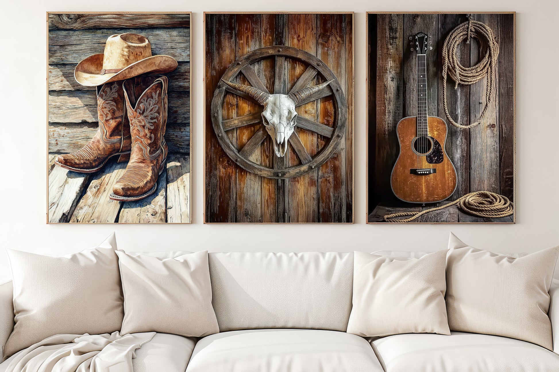 Set Of 3 Cowboy Canvas Painting, Symbols Of Cowboy Wall Art Decor, Poster Gift For Cowboy Lovers