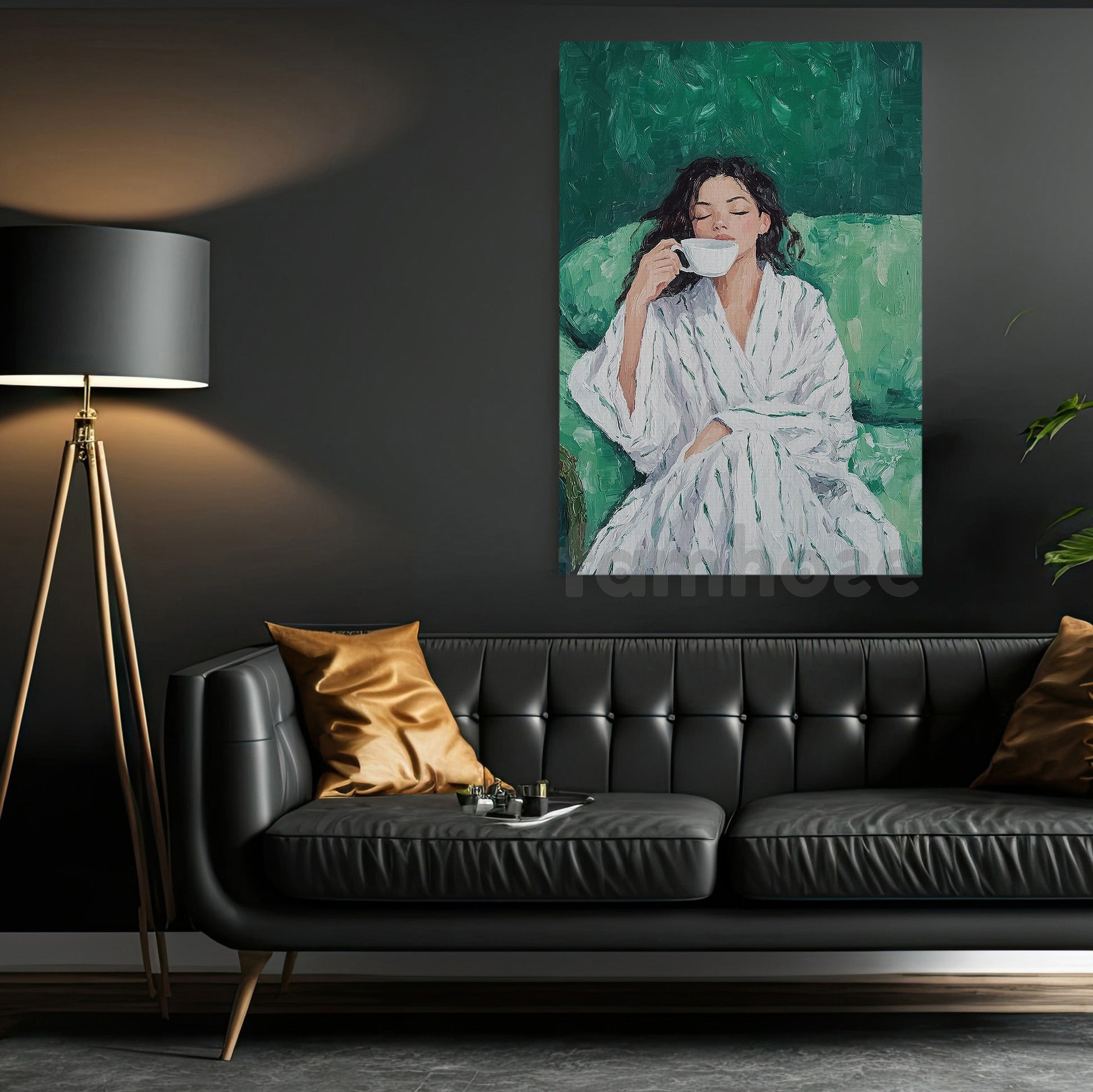 Soft Morning Coffee Canvas Painting, Elegant Woman Sitting On Sofa Wall Art Decor, Poster Gift For Coffee Lovers