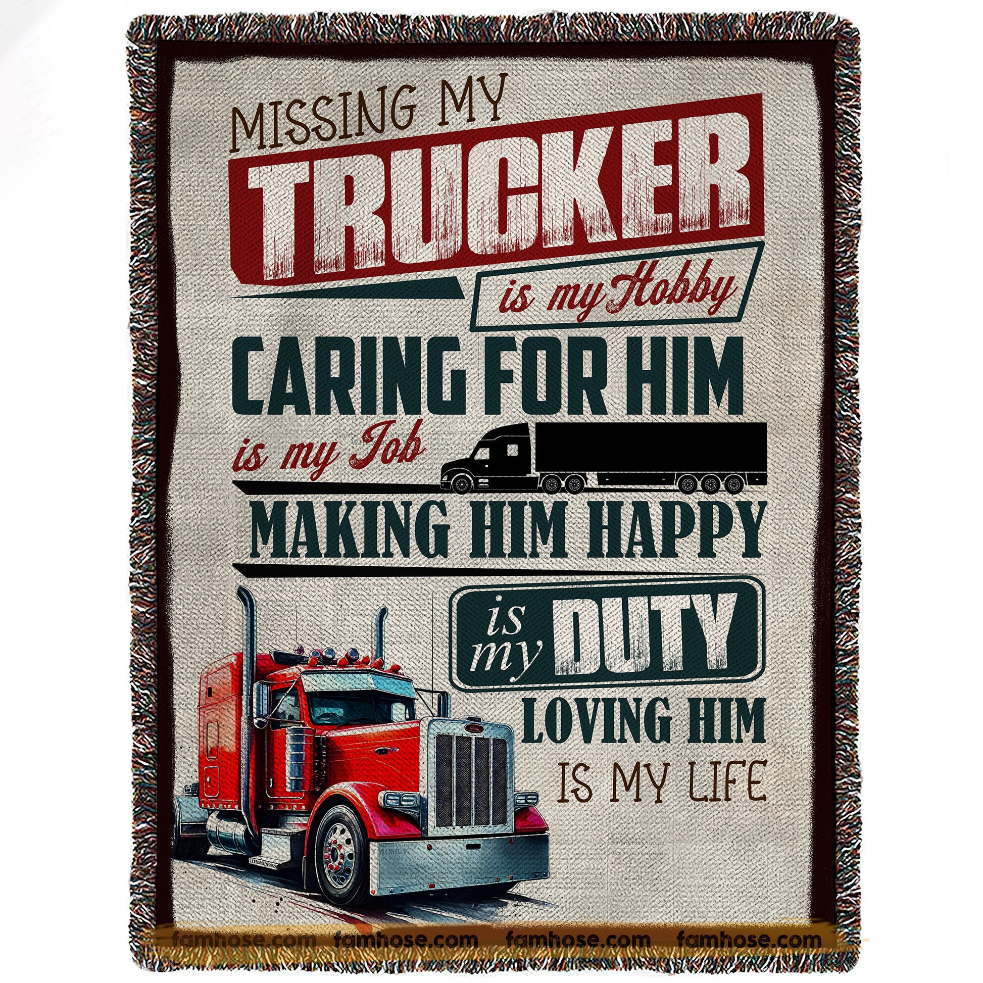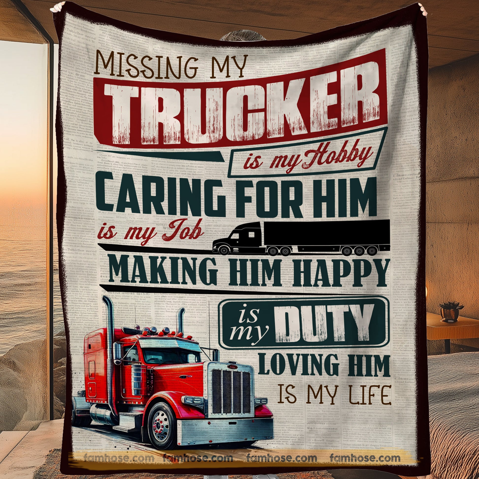 Trucker's Wife Fleece Blanket, Missing My Trucker Is My Hobby Woven Blanket, Cozy Sherpa Blanket Valentine Gift For Trucker's Wife