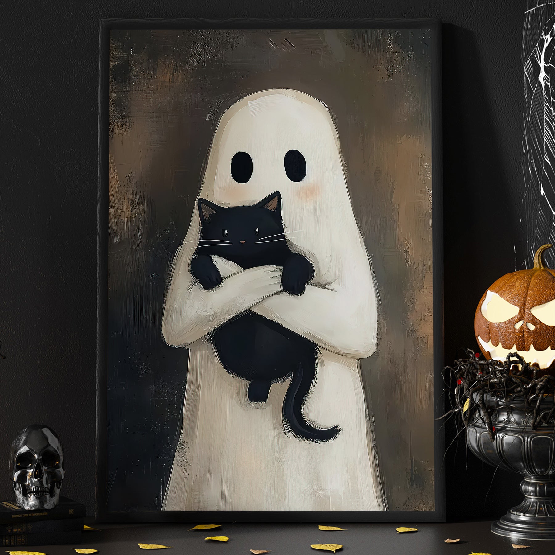Vintage Halloween Canvas Painting, Ghost Hug Cat Spooky Season Wall Art Decor, Halloween Poster Gift For Ghost Lovers
